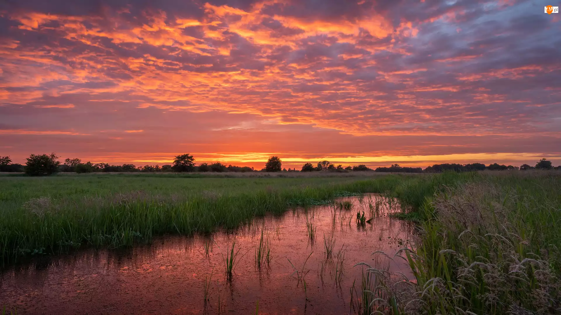Mokradła, Pole, Kolorowe, Zachód słońca, Trawa, Chmury