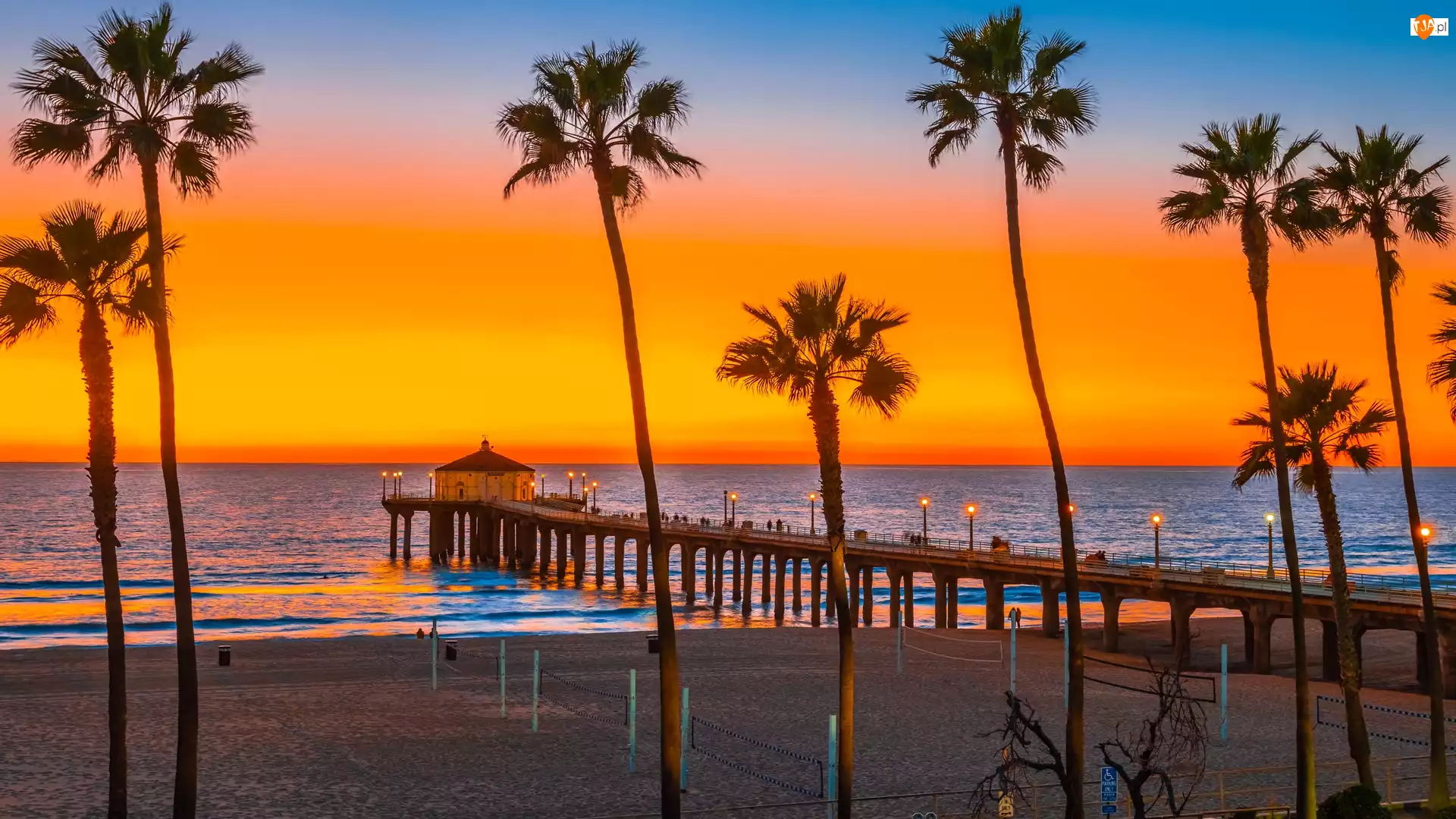 Molo, Zachód słońca, Plaża, Morze, Palmy