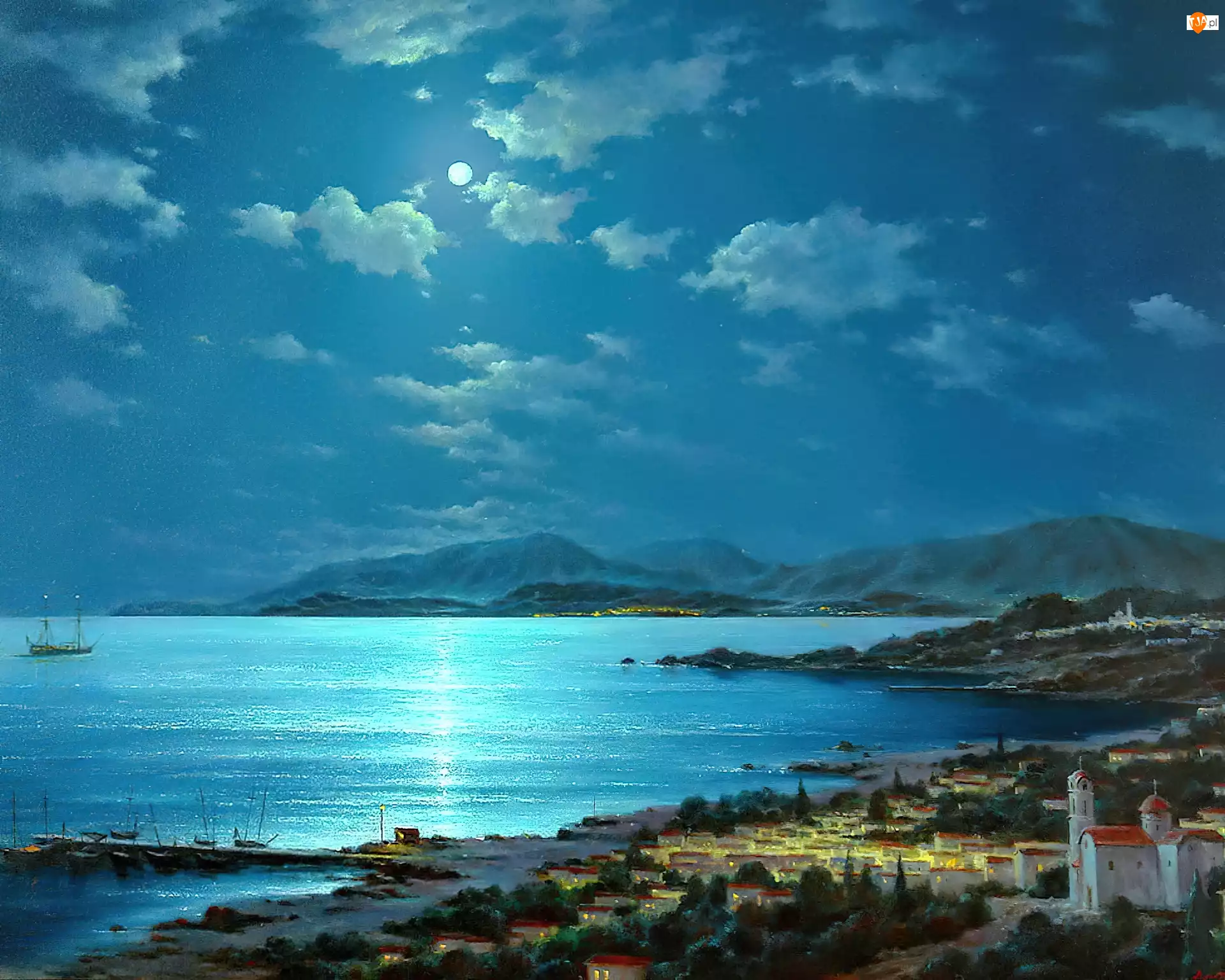 Morze, Miasteczko, Góry, Noc