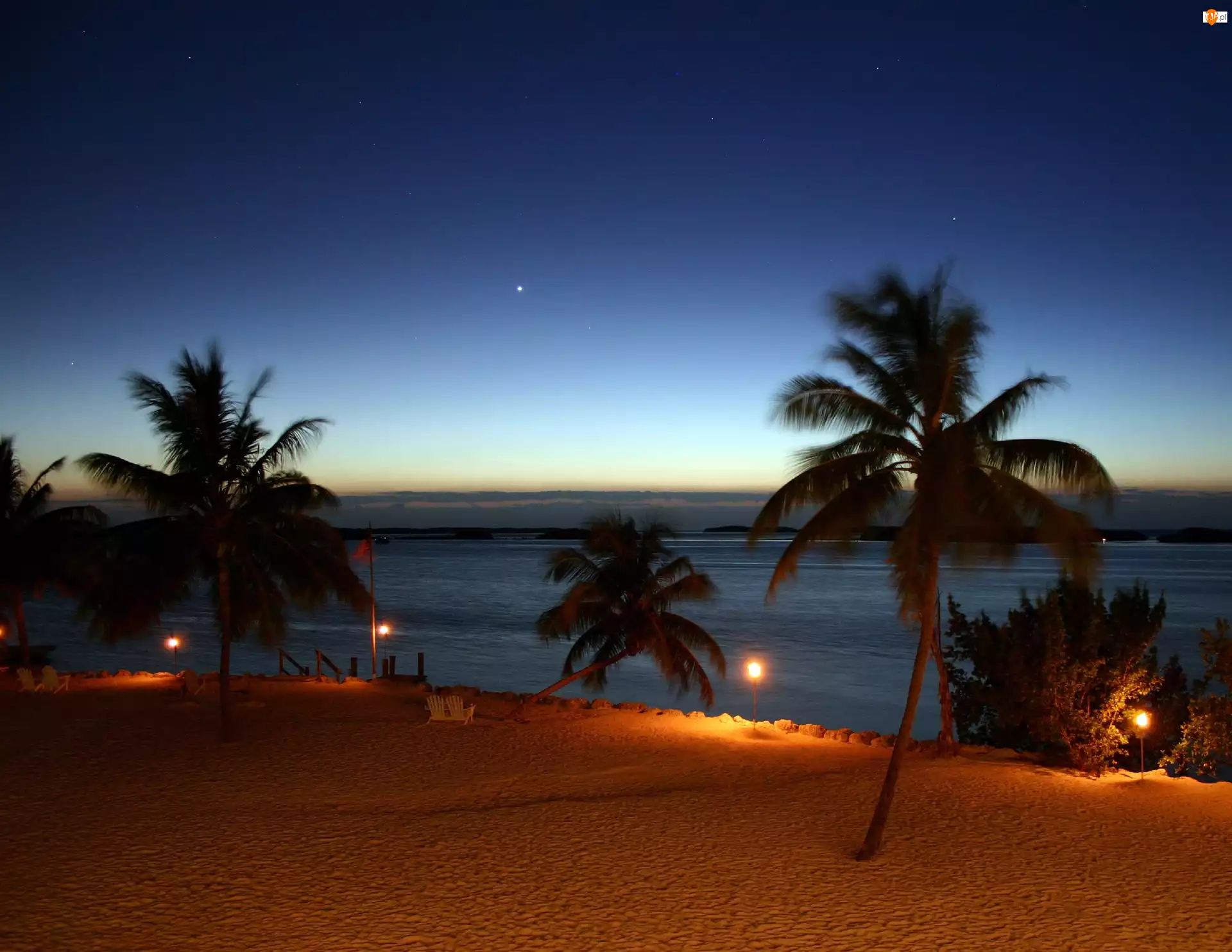 Morze, Noc, Plaża, Palmy
