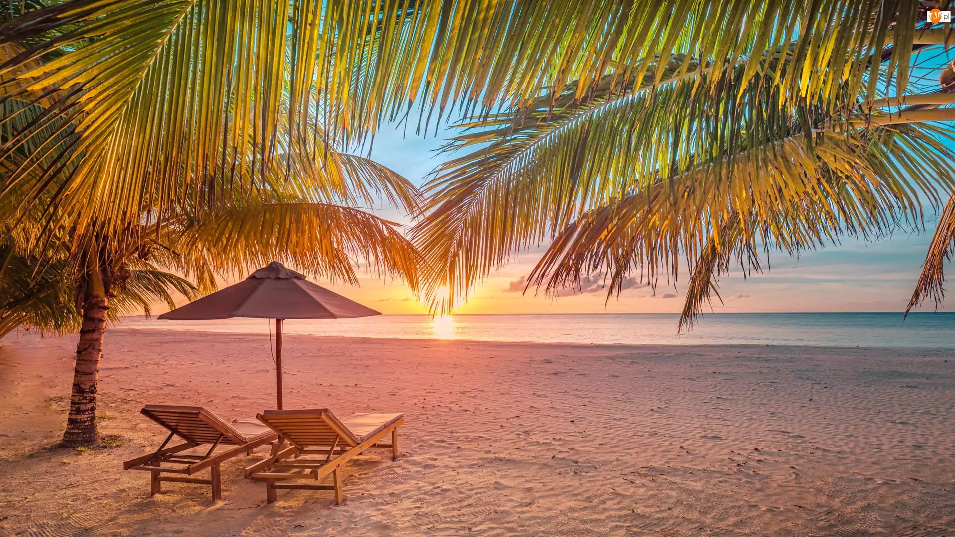 Morze, Plaża, Zachód słońca, Malediwy, Parasol, Leżaki, Palmy