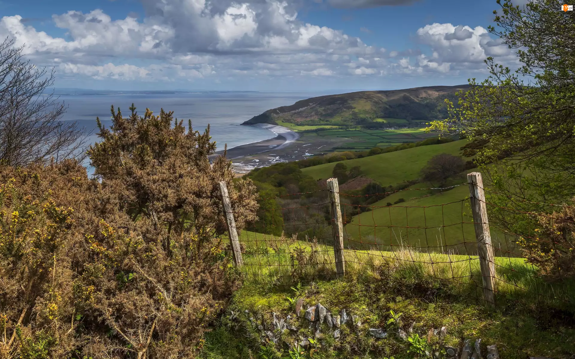 Morze, Pola, Drzewa, Ogrodzenie, Wybrzeże
