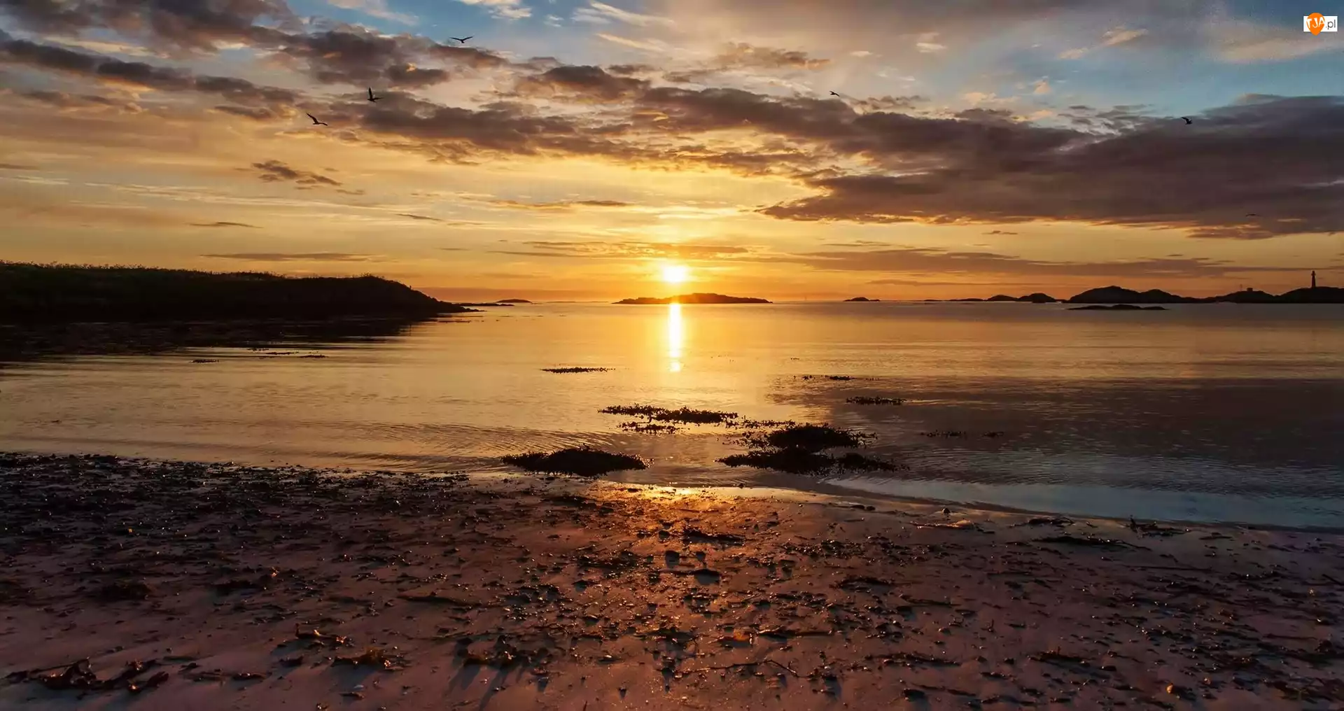 Morze, Skały, Zachód, Niebo, Słońca, Piasek
