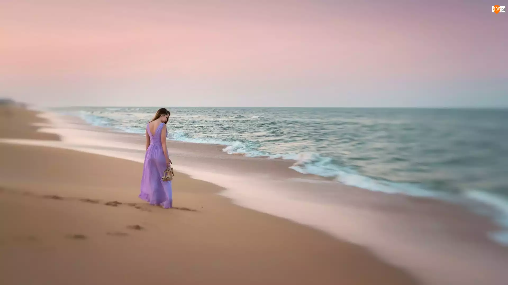 Morze, Wschód, Kobieta, Słońca, Plaża, Fale