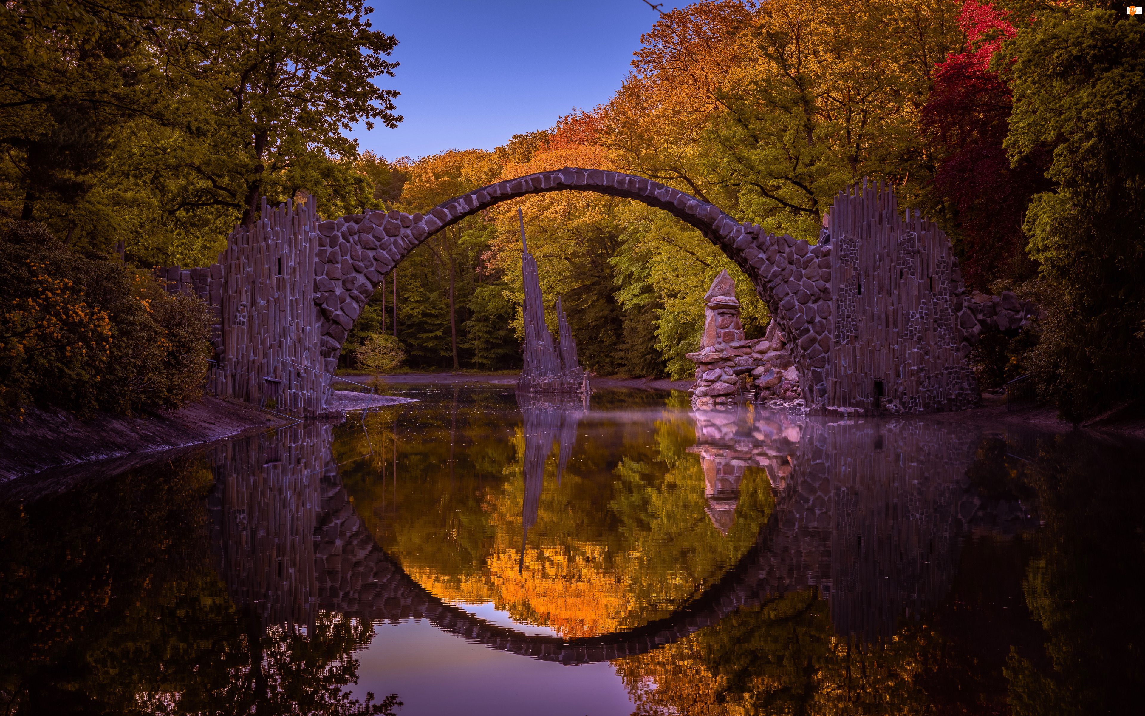 Niemcy, Jesień, Saksonia, Rakotz Lake, Devils Bridge, Most, Zachód słońca, Wieczór, Jezioro, Park Rododendronów Kromlau