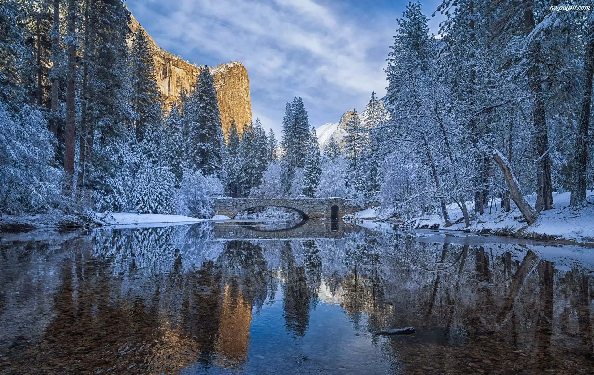 Rzeka, Zima, Drzewa, Odbicie, Most, Góry