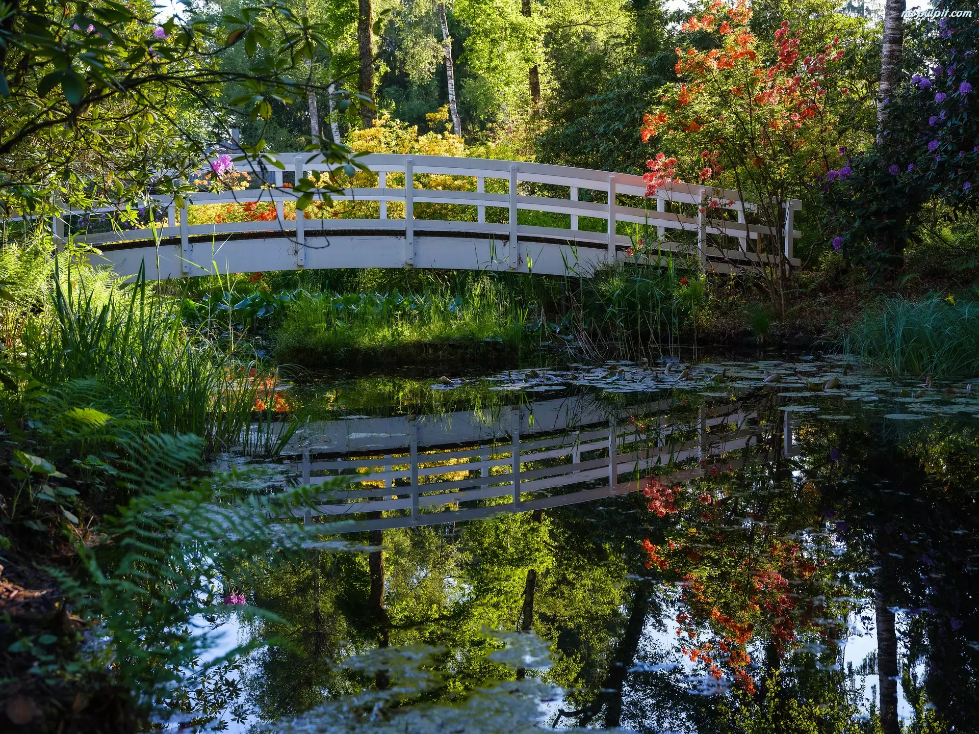 Most i rododendrony nad stawem
