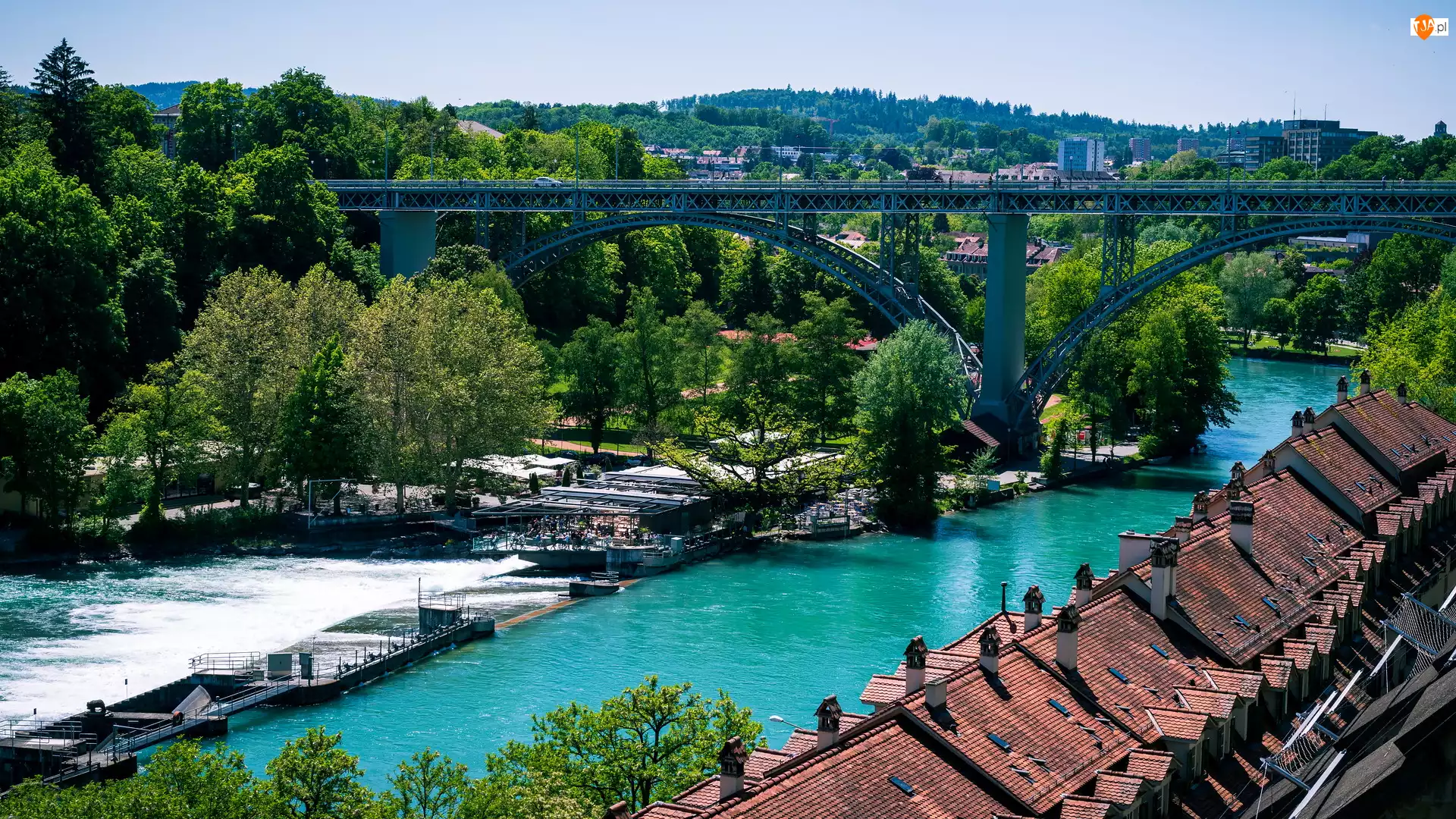 Drzewa, Rzeka, Dachy, Berno, Aare river, Domów, Szwajcaria, Most