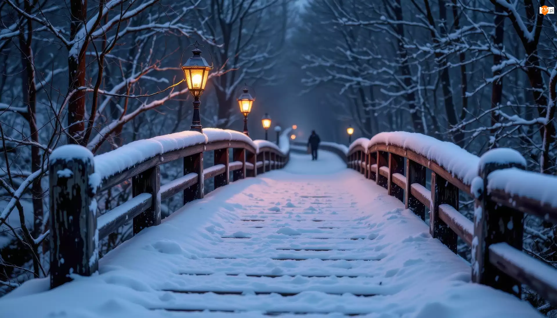 Most, Zima, Człowiek, Drzewa, Latarnie, Park