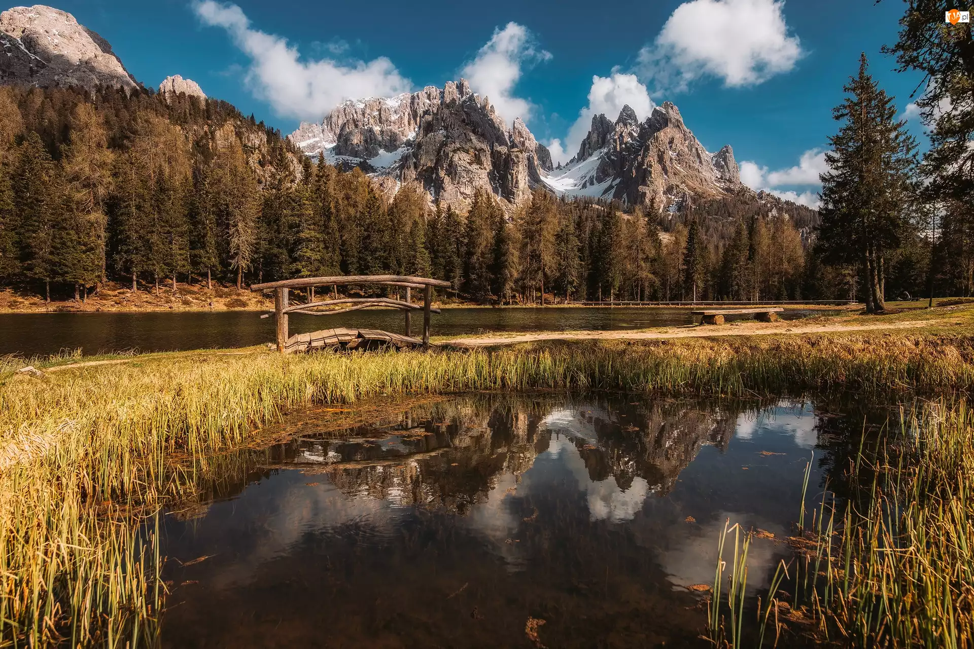 Włochy, Góry, Dolomity, Szuwary, Antorno Lake, Jezioro, Mostek, Ścieżka, Ławka, Alpy