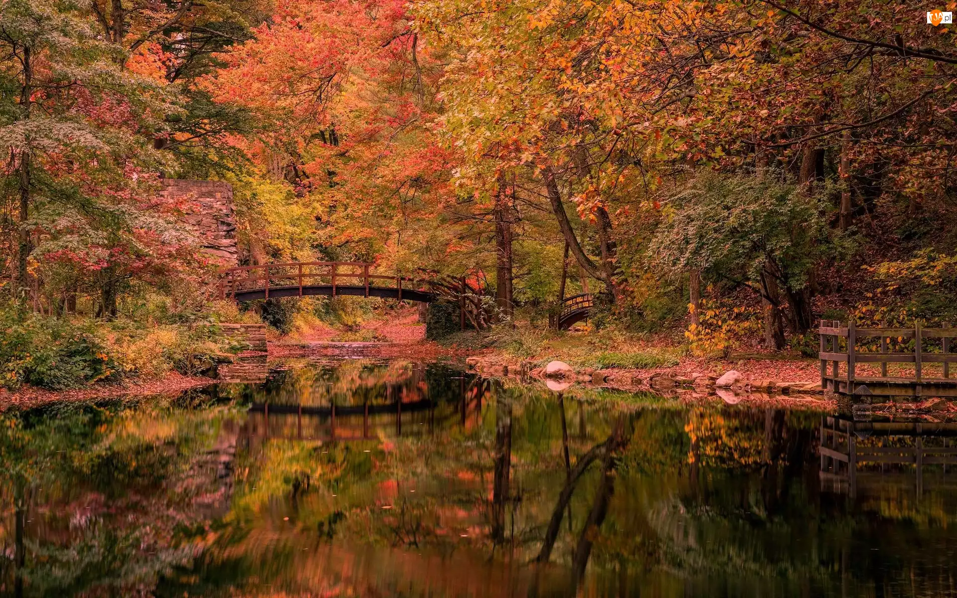 Stany Zjednoczone, Drzewa, Ohio, Stan Hywet Hall and Gardens, Akron, Mostek, Ogród, Jesień, Rzeka