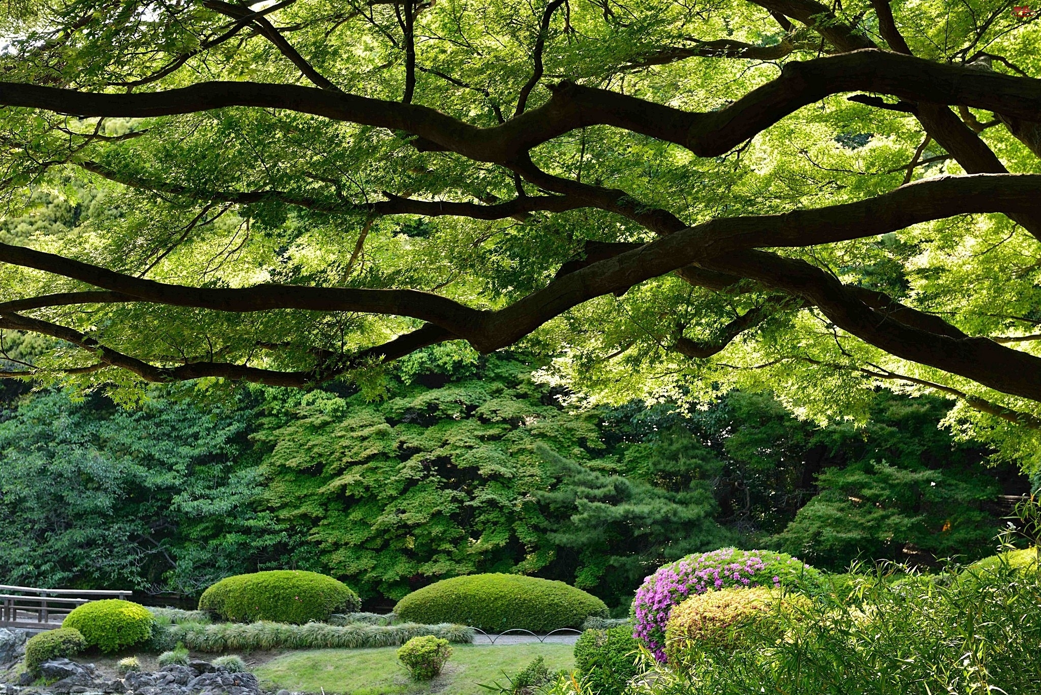 Mostek, Park, Drzewo, Rozłożyste, Klomby
