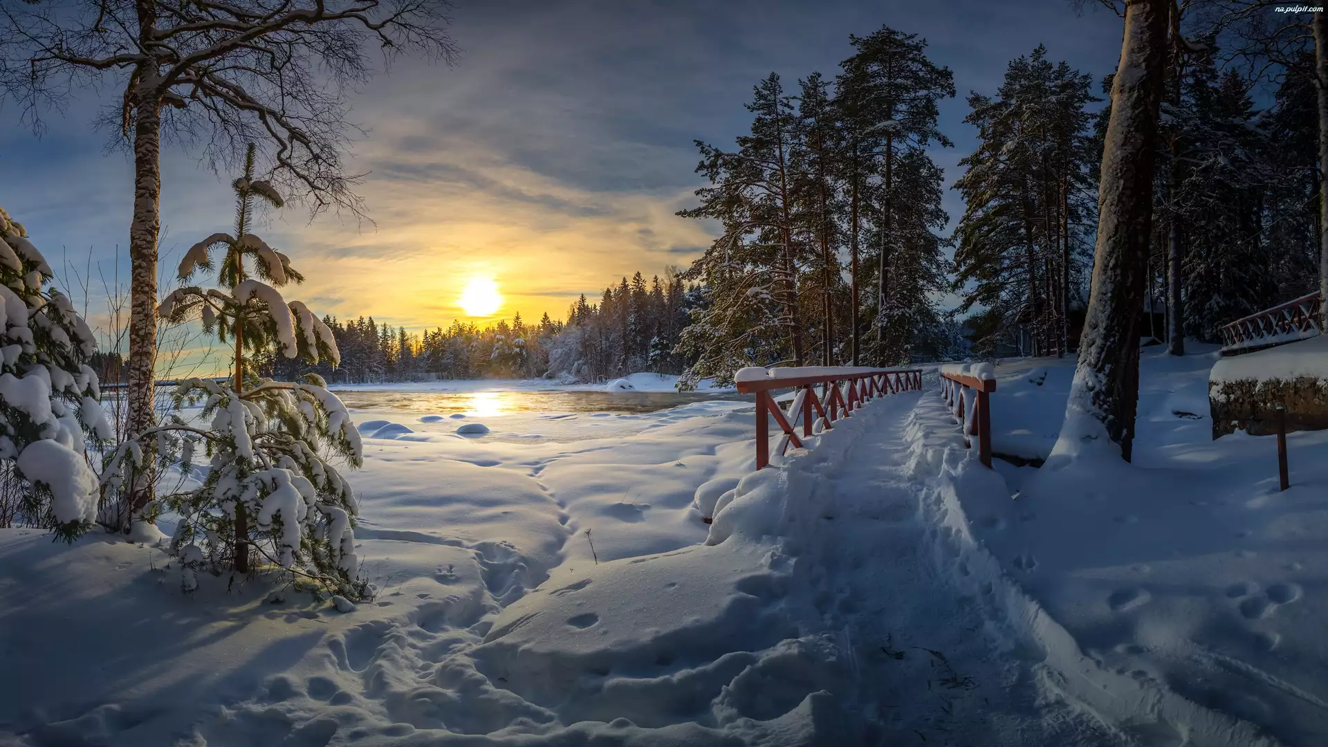 Wschód słońca, Zima, Rzeka Langinkoski, Kotka, Las, Mostek, Finlandia, Drzewa