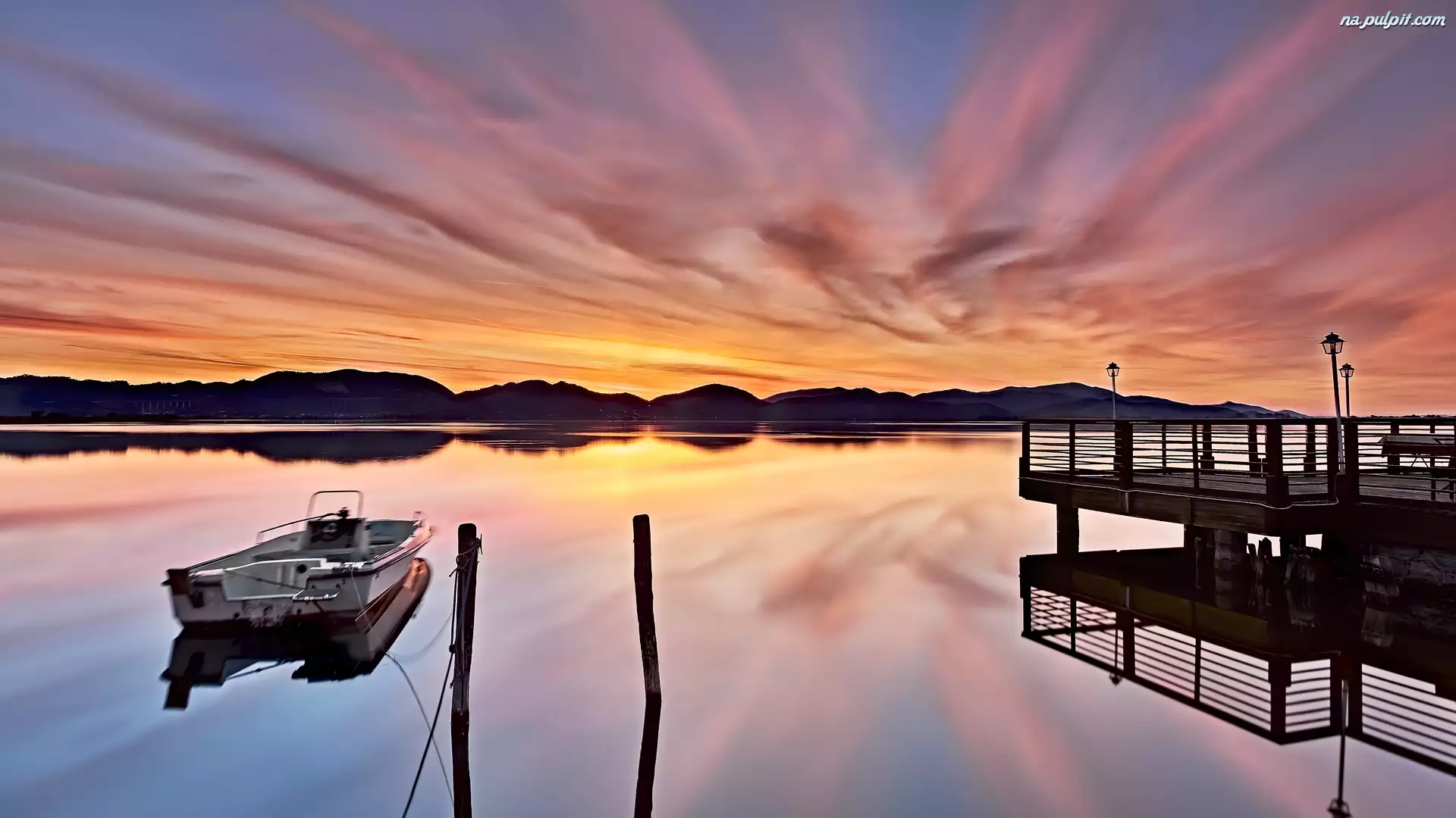 Motorówka, Zachód słońca, Molo, Jezioro, Wzgó