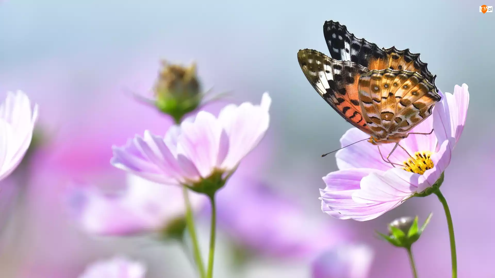 Kosmee, Rusałka osetnik, Kwiaty, Różowe, Motyl
