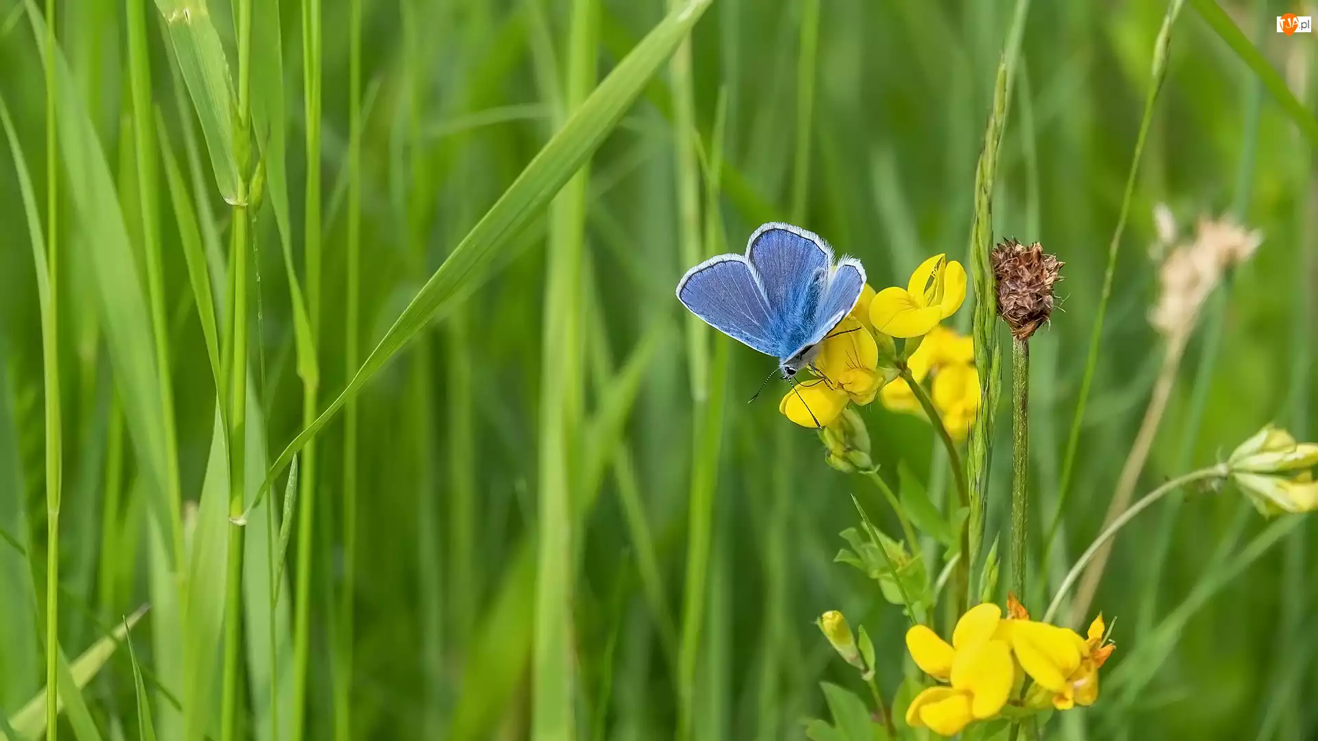 Motyl, Trawa, Komonica, Kwiaty, Modraszek ikar