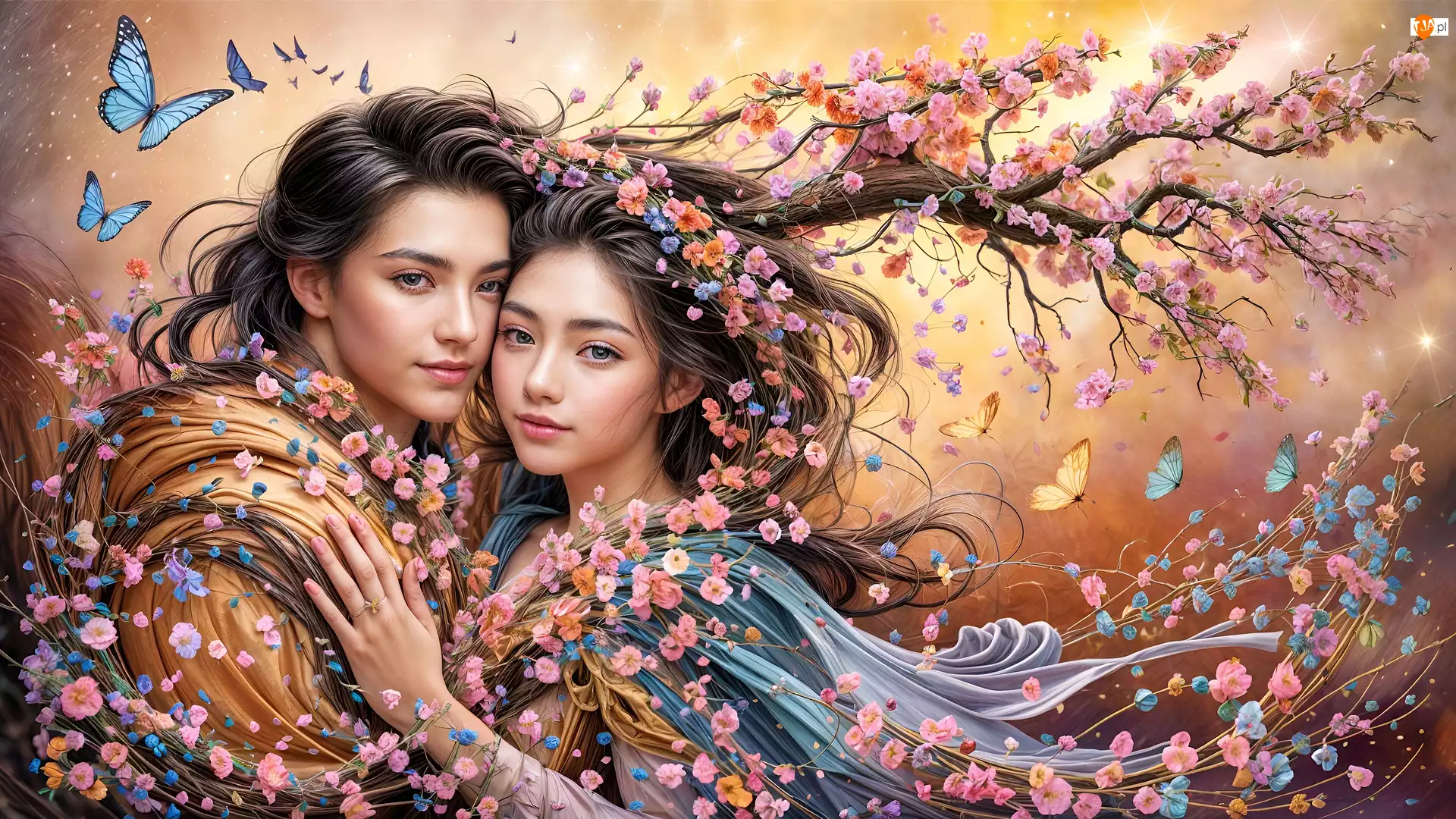 Mężczyzna, Kobieta, Kwiaty, Grafika, Motyle, Gałąź