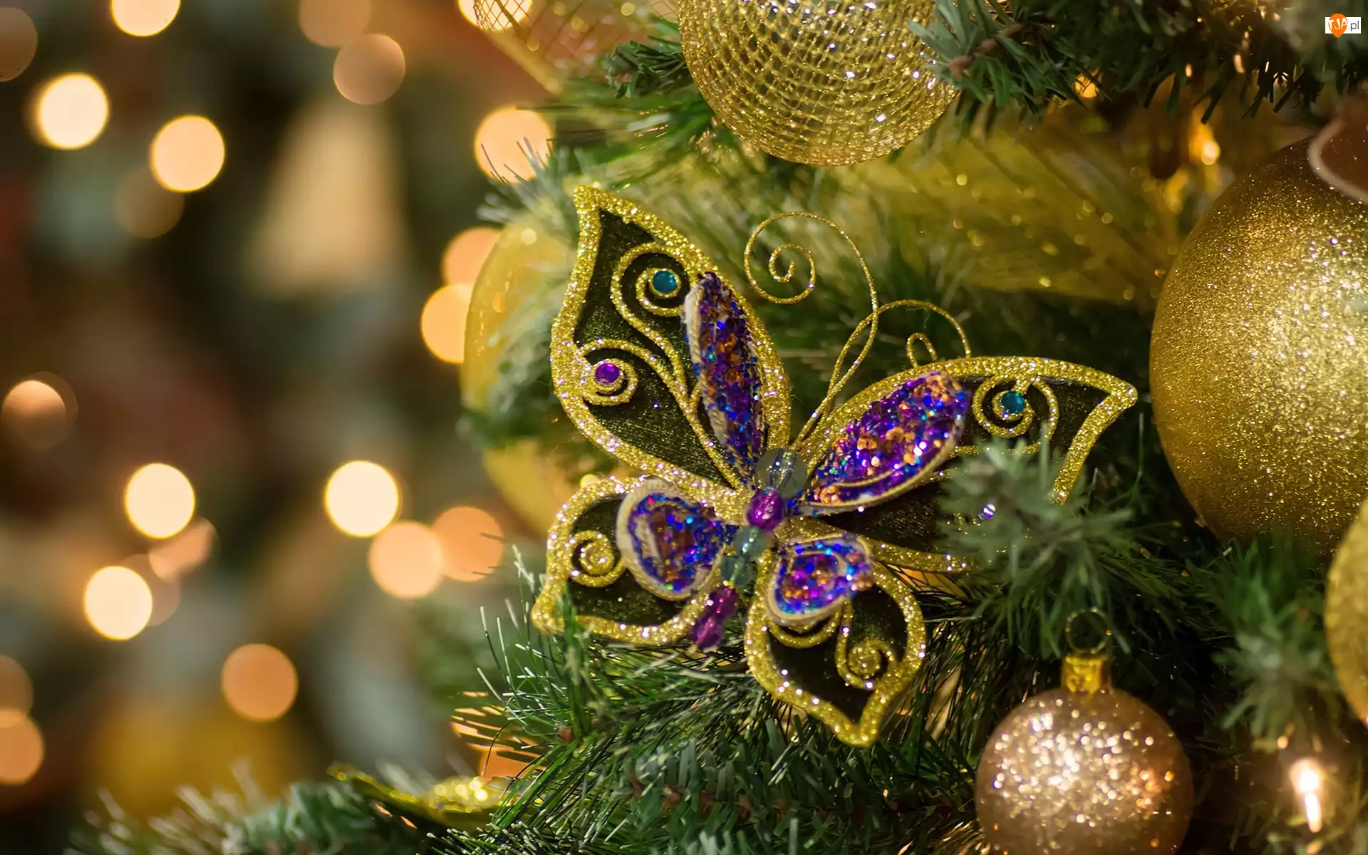 Motylek, Złote, Narodzenie, Boże, Ozdoby, Choinka, Bombki
