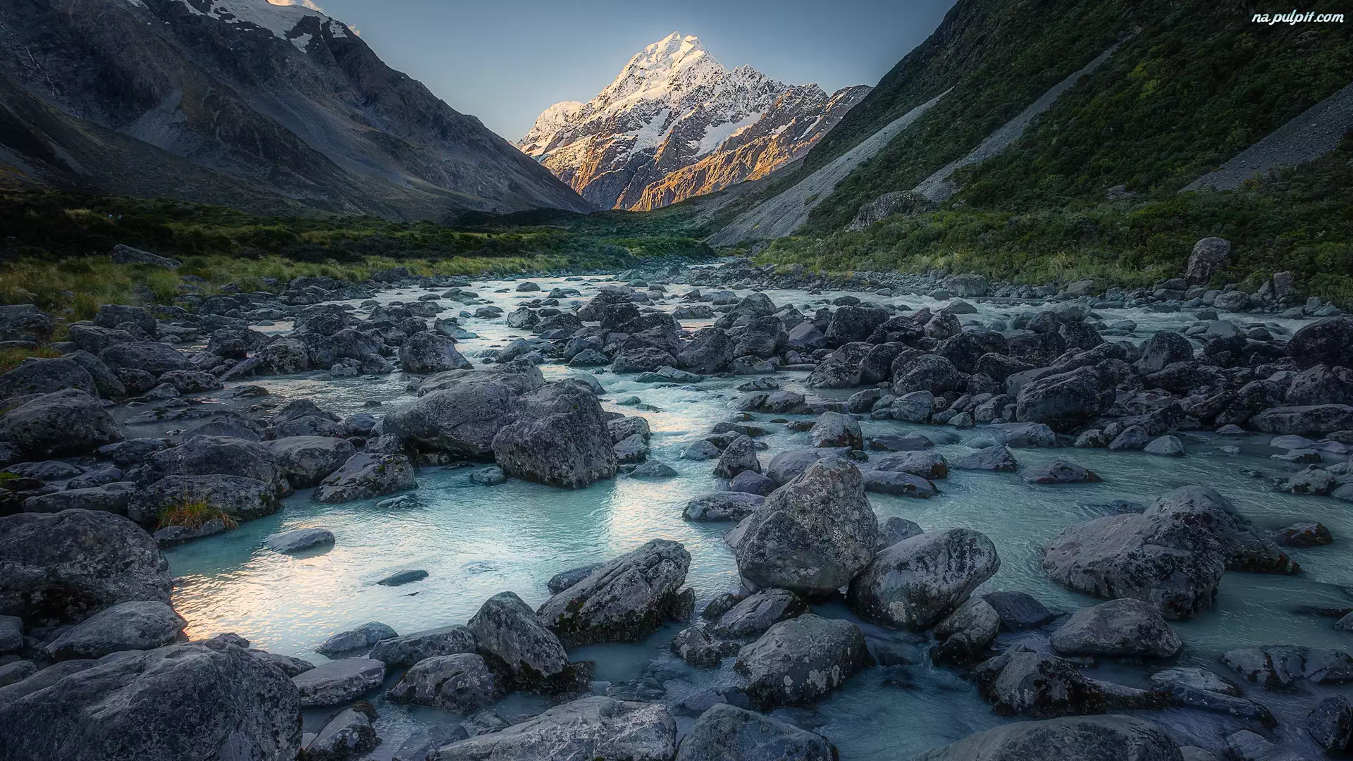 Mount Cook, Nowa Zelandia, Park Narodowy Góry Cooka, Góry, Rzeka, Góra Cooka, Kamienie, Hooker River