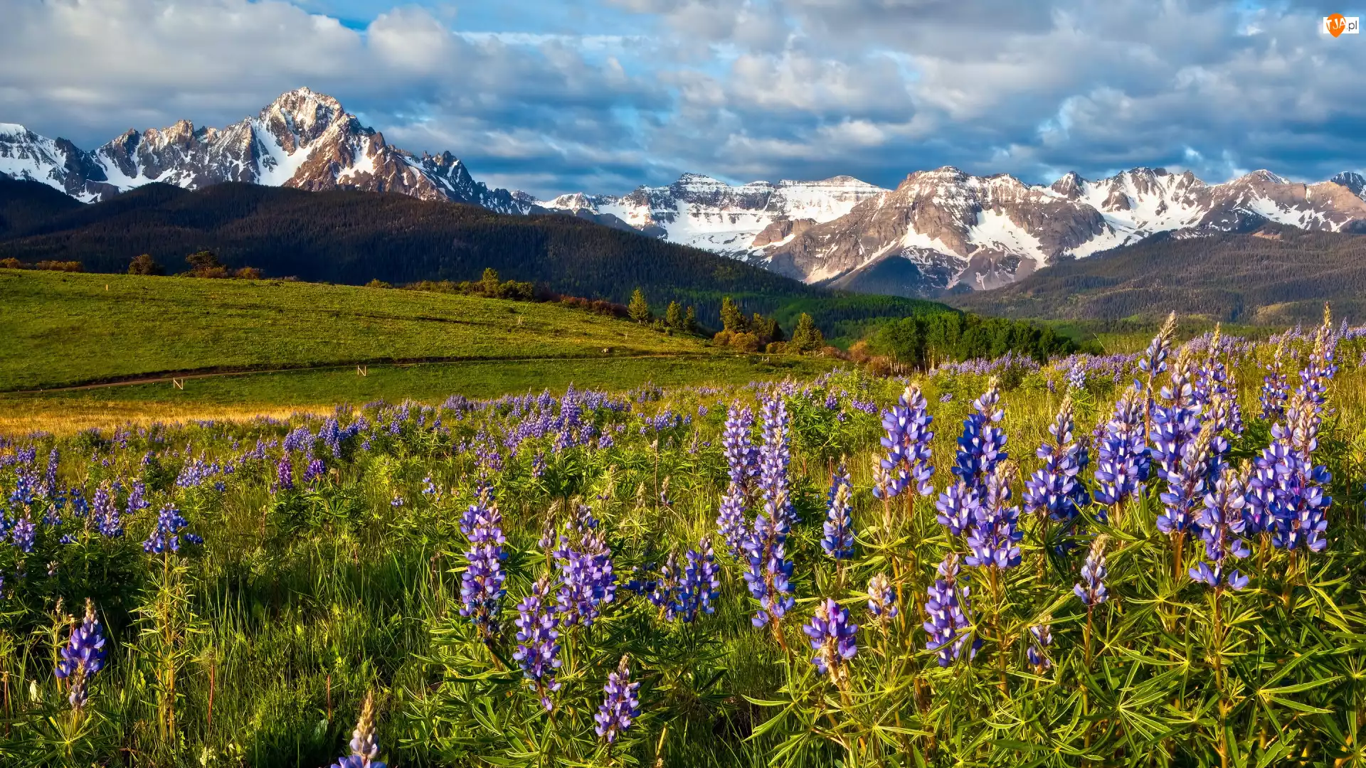 Mount Sneffels, Łąka, Drzewa, Kwiaty, Kolorado, Zieleń, Góry, Stany Zjednoczone, Łubin, San Juan Mountains, Chmury