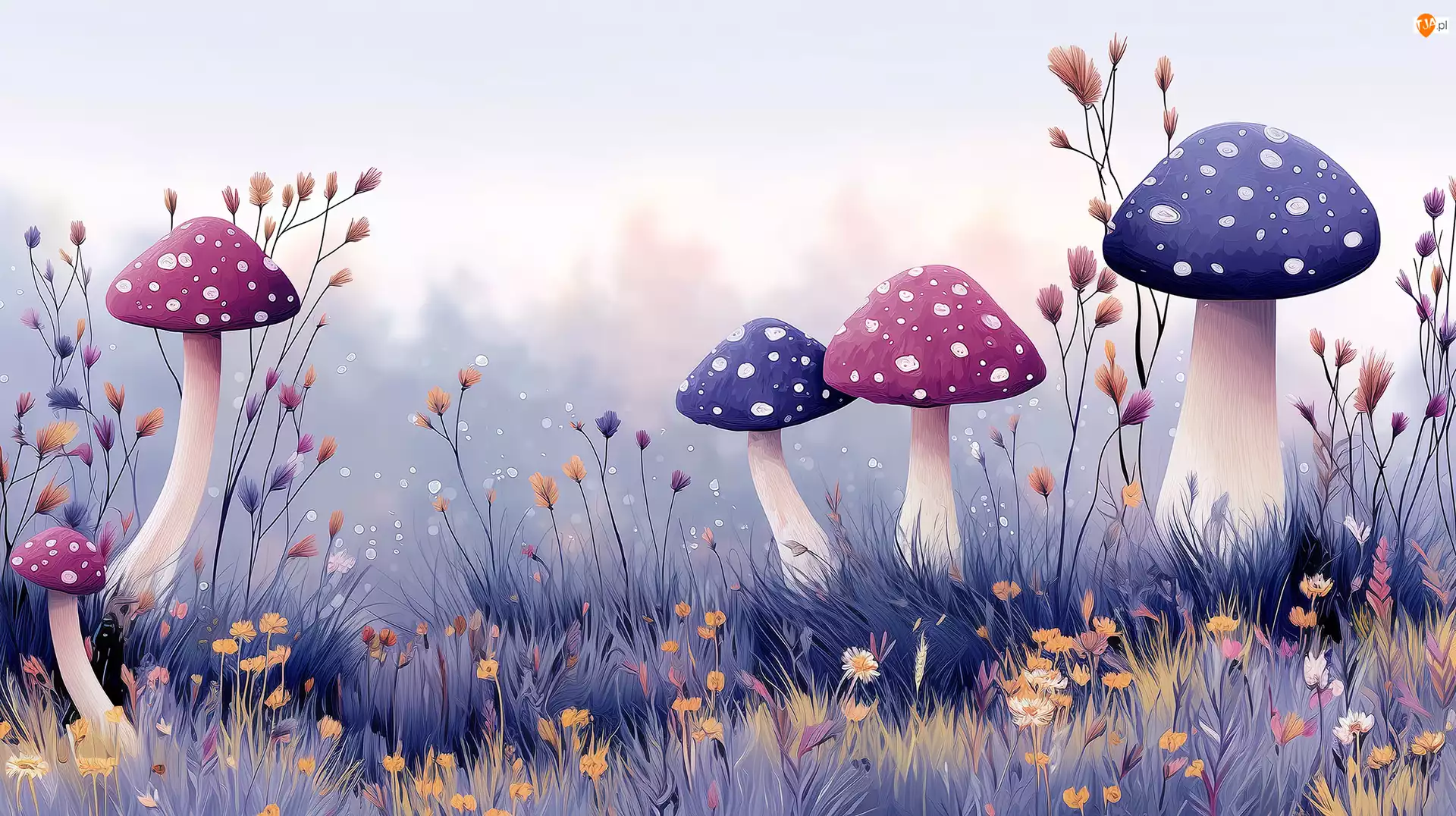 Muchomory, Grafika AI, Kolorowe, Grzyby, Kwiaty