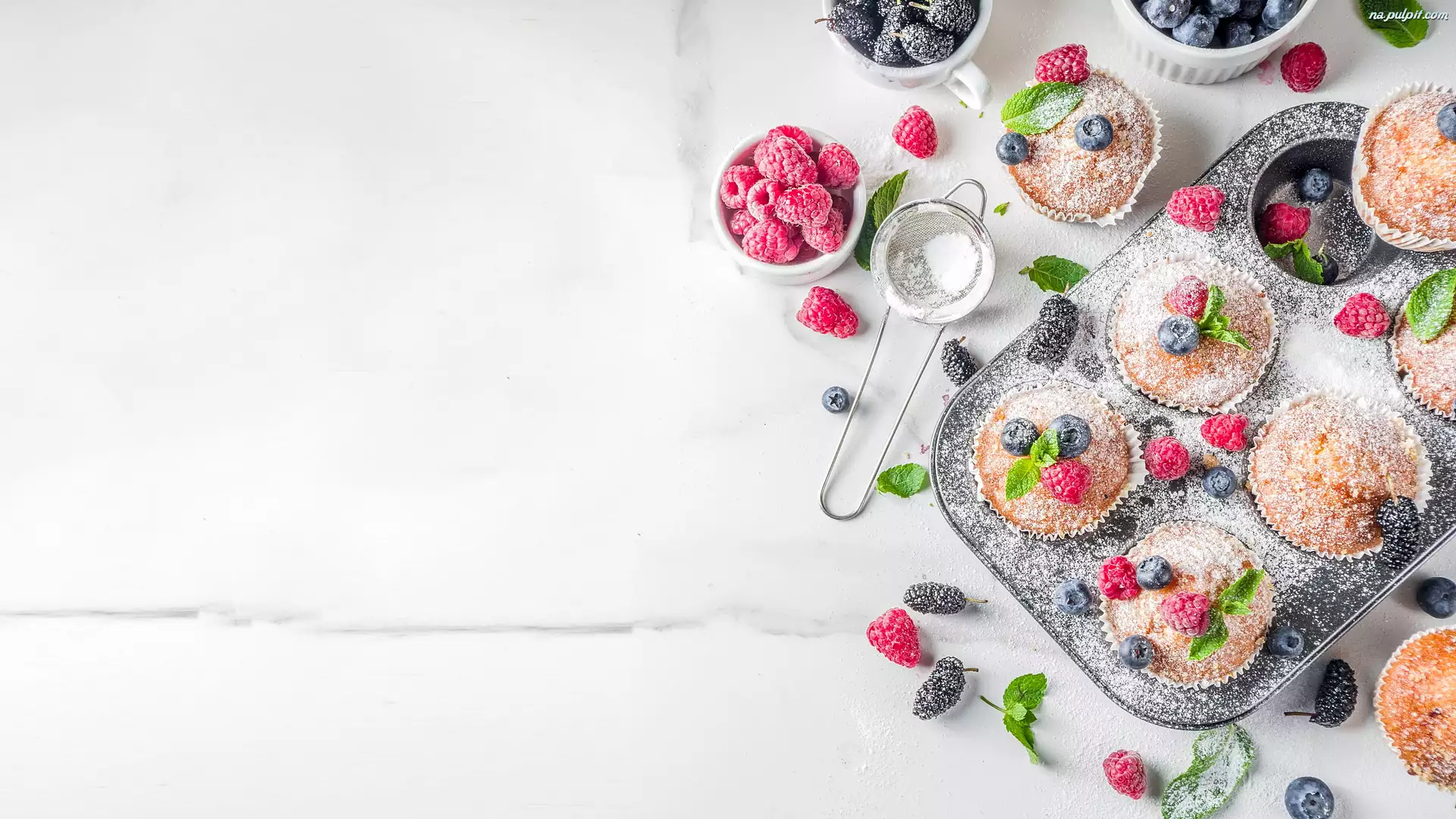Sitko, Babeczki, Jagody, Listki, Muffinki, Cukier puder, Mięty, Maliny