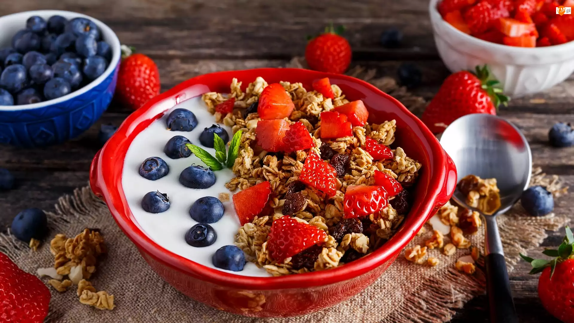 Jogurt, Owoce, Miseczka, Płatki, Czerwona, Truskawki, Borówki