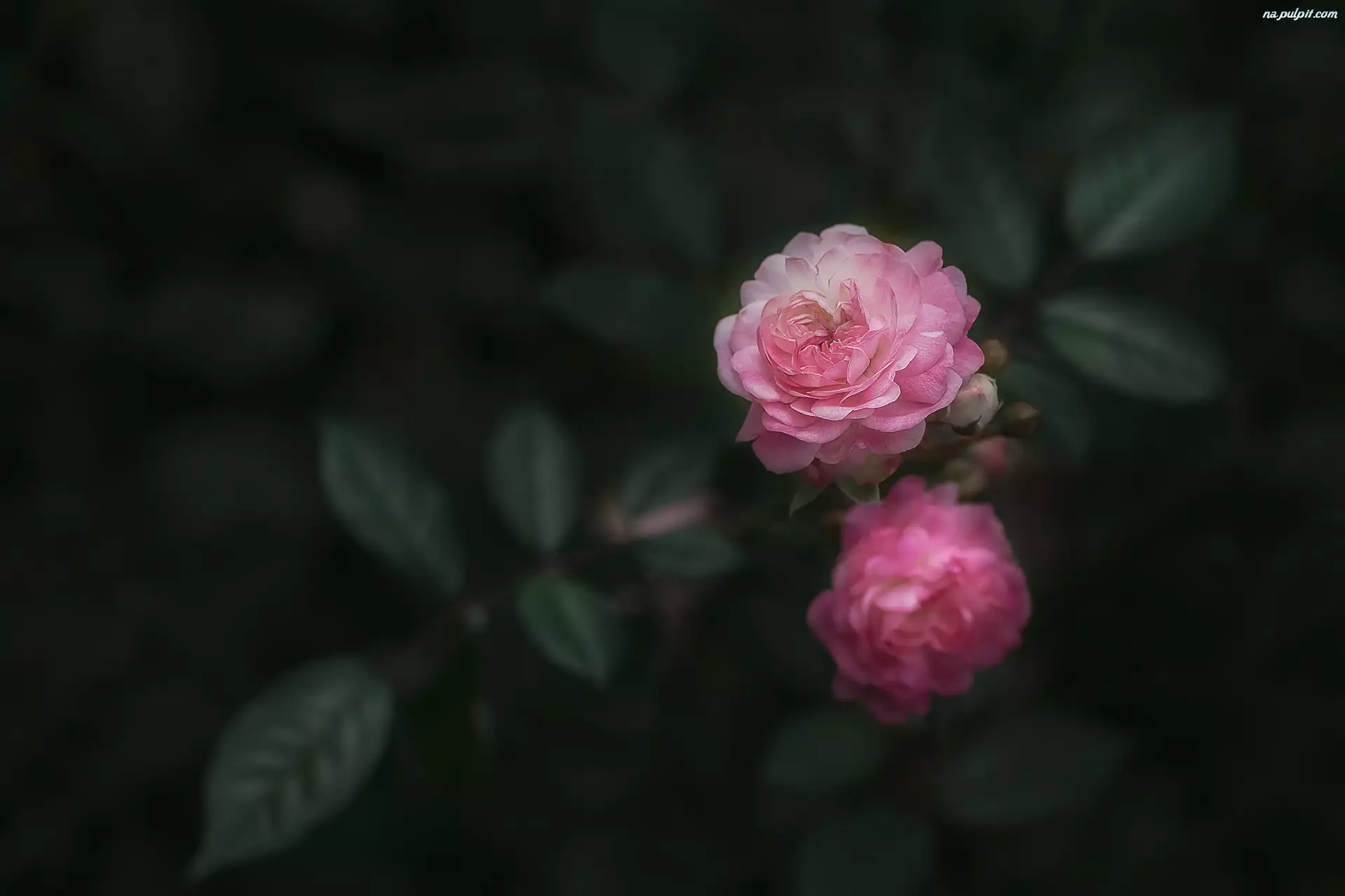 Na ciemnym tle dwie różyczki z listkami