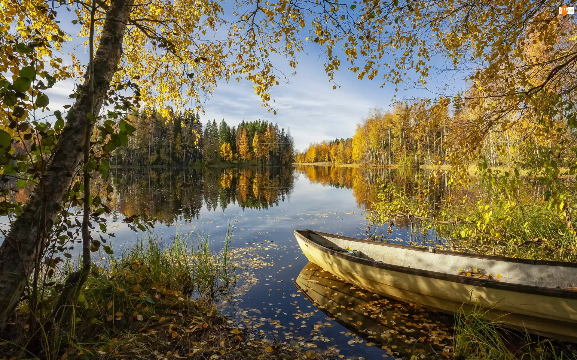 Jesień, Jezioro, Brzozy, Słoneczny, Łódka, Las, Dzień, Drzewa