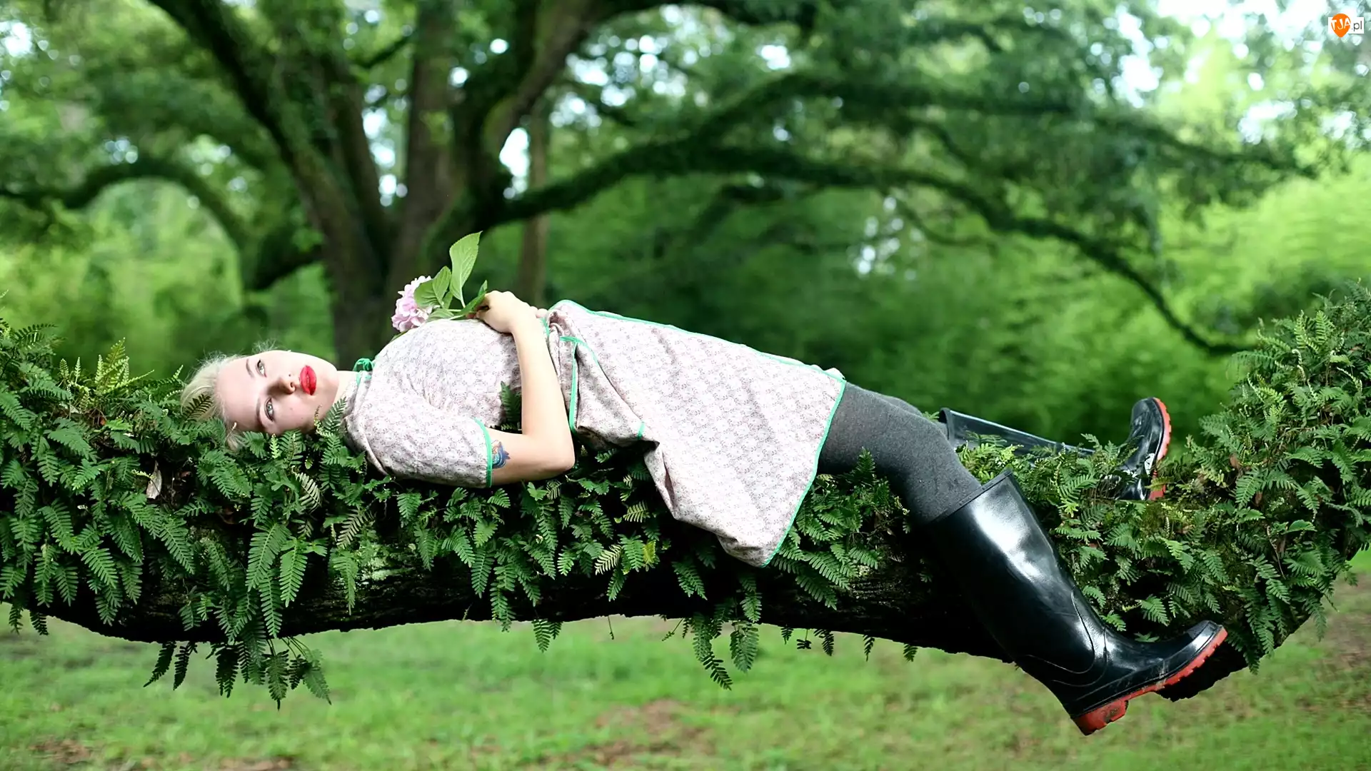 Na, Kalosze, Kobieta, Zieleń, Lężąca, Gałęzi