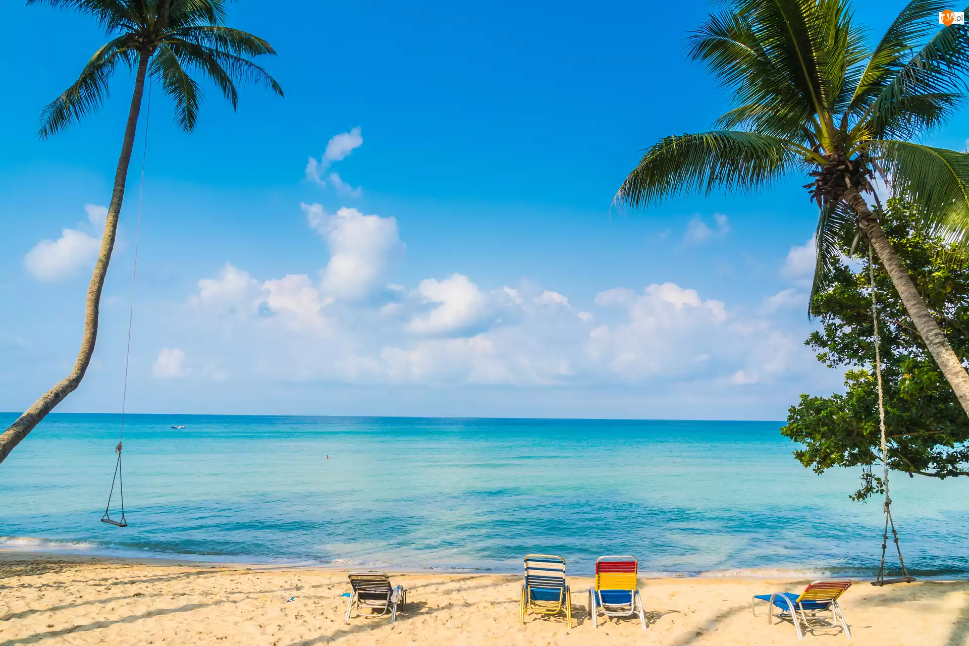Palmy, Leżaki, Plaża, Morze, Hustawki