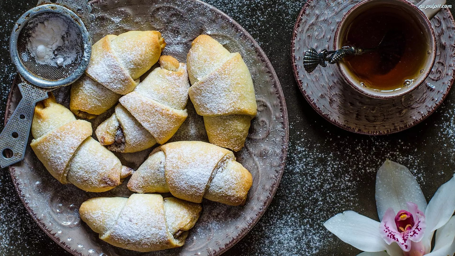 Cukier puder, Sitko, Kubek, Rogaliki, Herbata, Kwiat, Talerz
