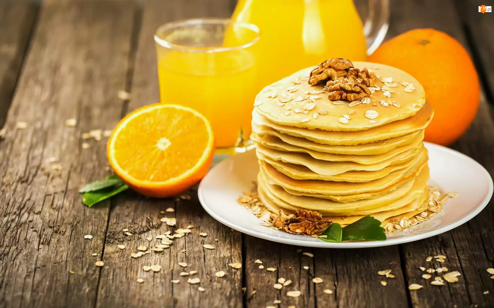 Orzechy włoskie, Naleśniki, Sok, Deski, Pomarańcz, Talerz