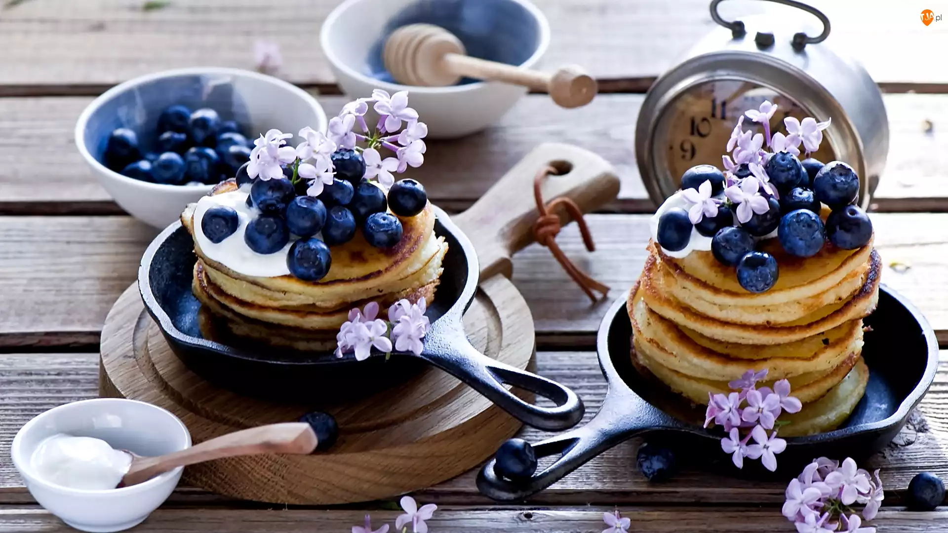 Bez, Budzik, Deski, Łyżeczka, Jagody, Naleśniki, Śmietana, Patelnie, Miseczka, Kwiatki