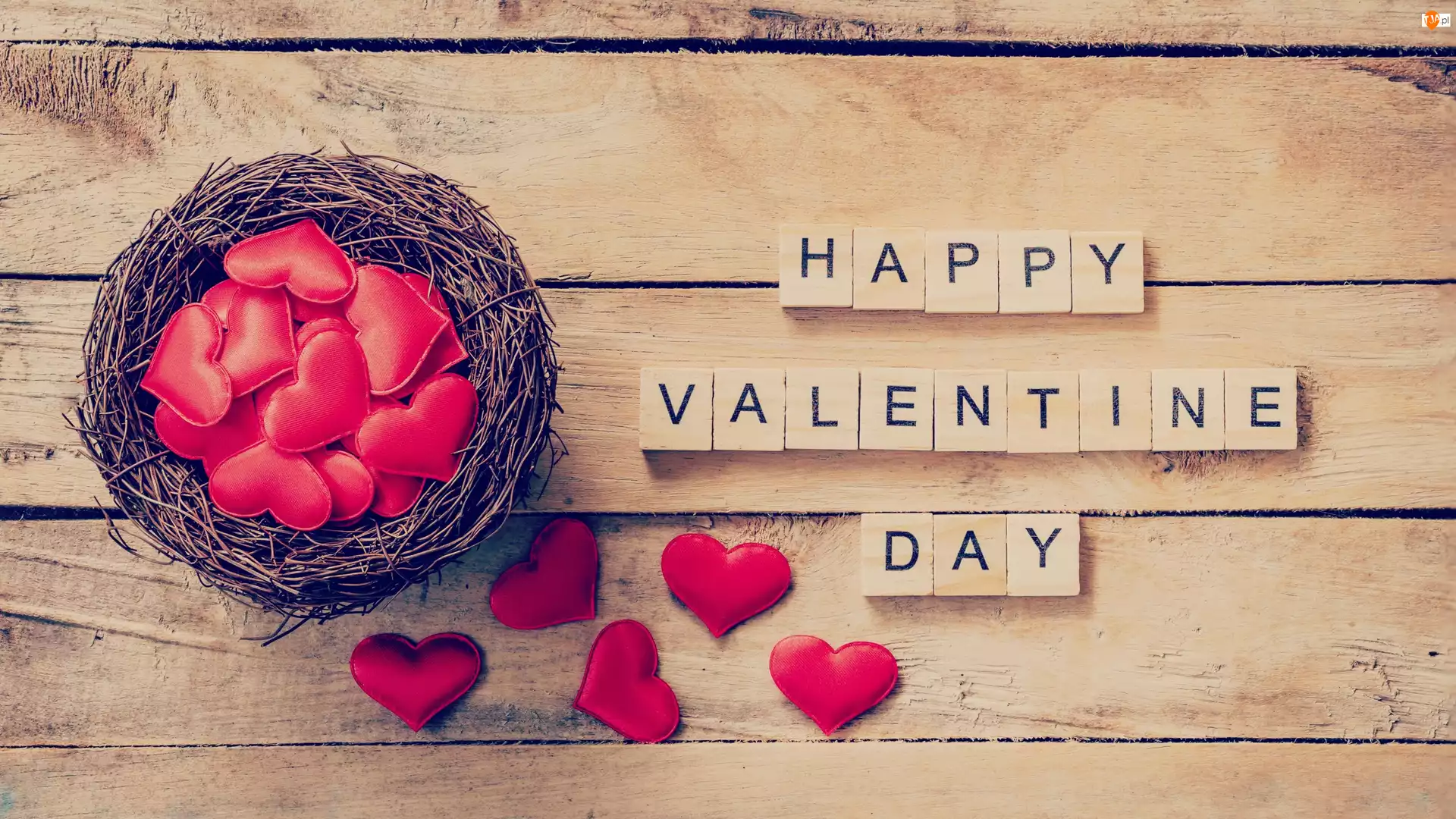 Czerwone, Happy Valentine Day, Walentynki, Deski, Serduszka, Napis