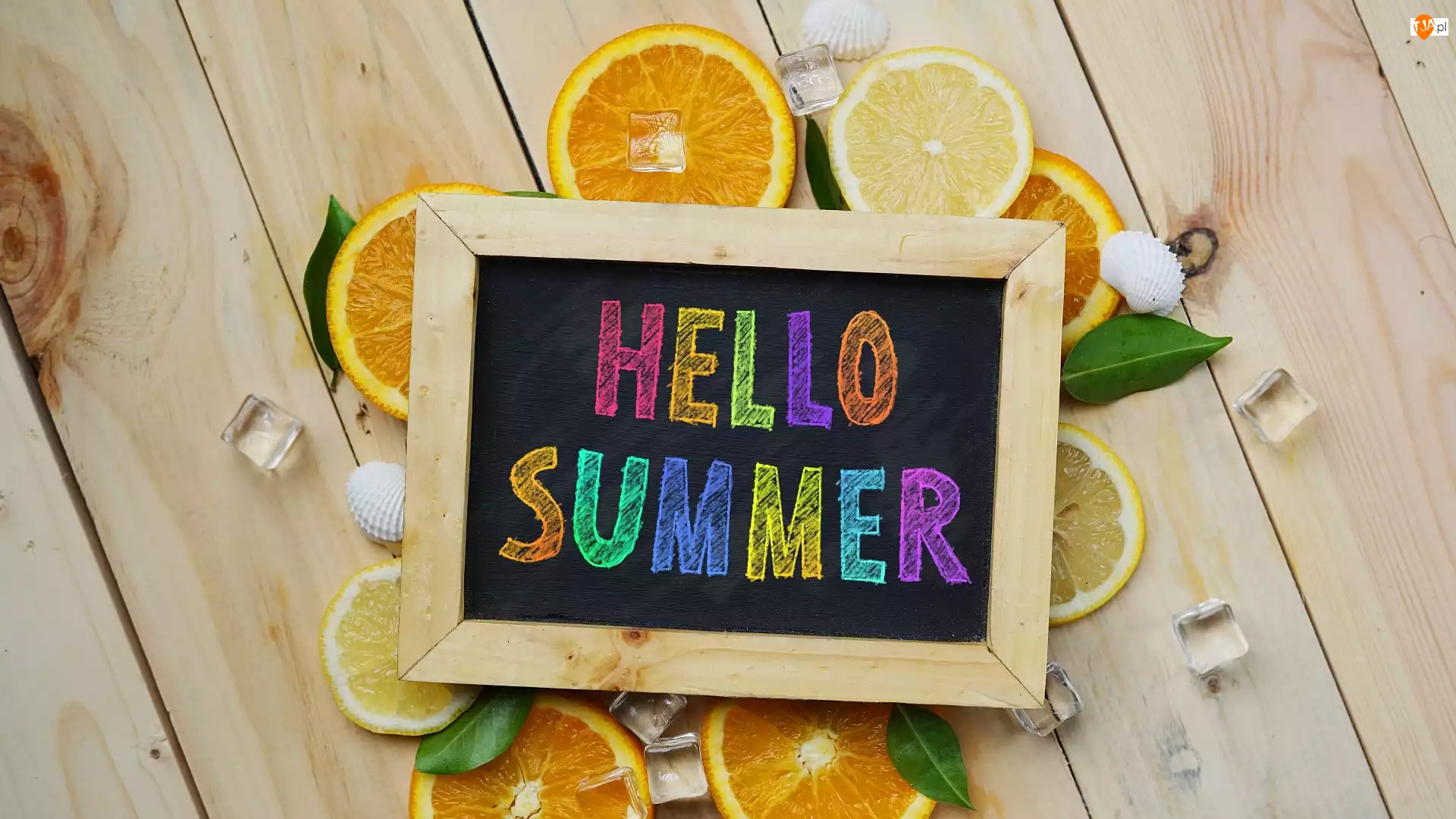 Deski, Napis, Lodu, Plastry, Kostki, Hello Summer, Pomarańcze, Tabliczka, Limonka