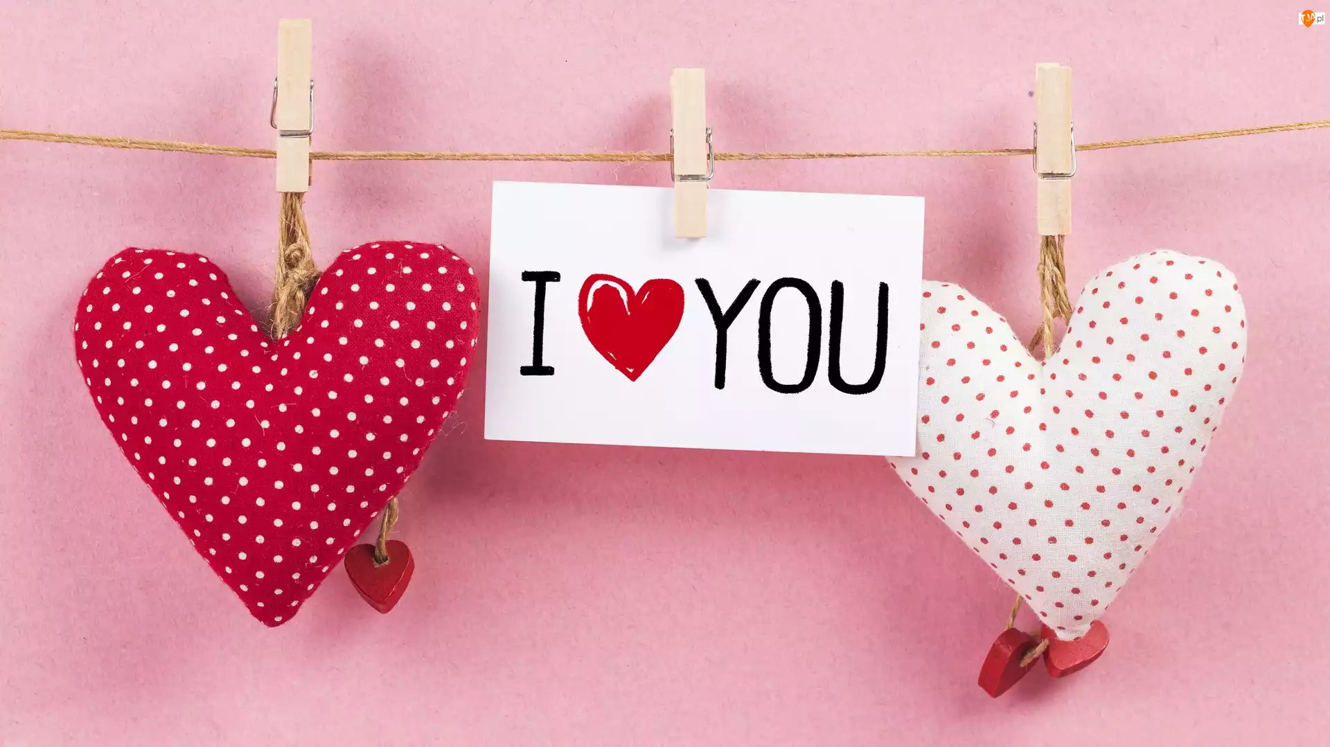 Kartka, Serca, I love You, Spinacze, Napis, Sznurek