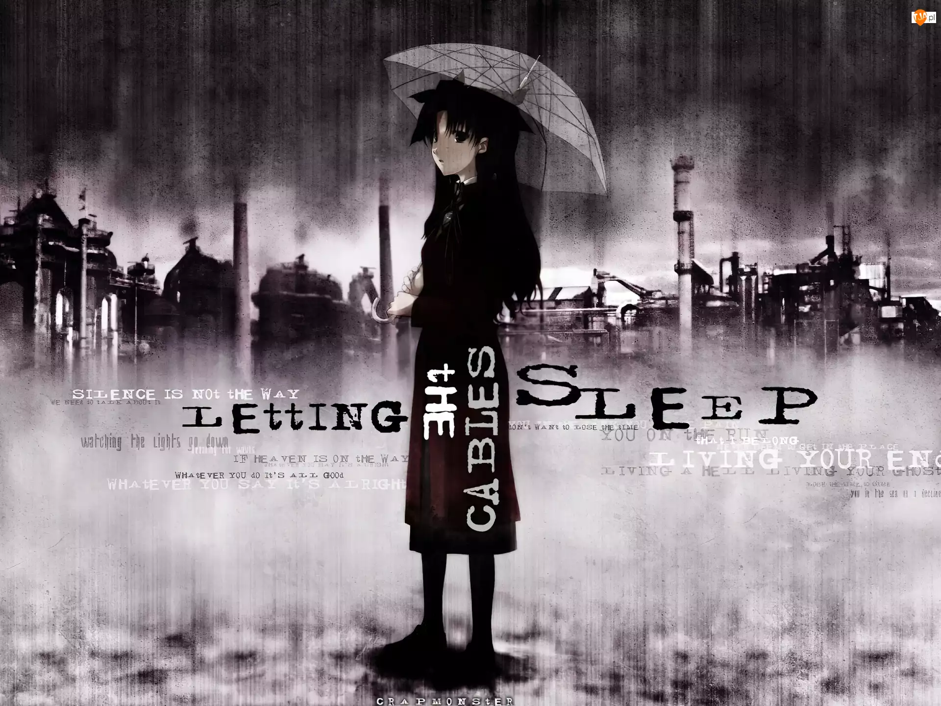 napisy, miasto, Fate Stay Night, fabryka, postać, parasolka