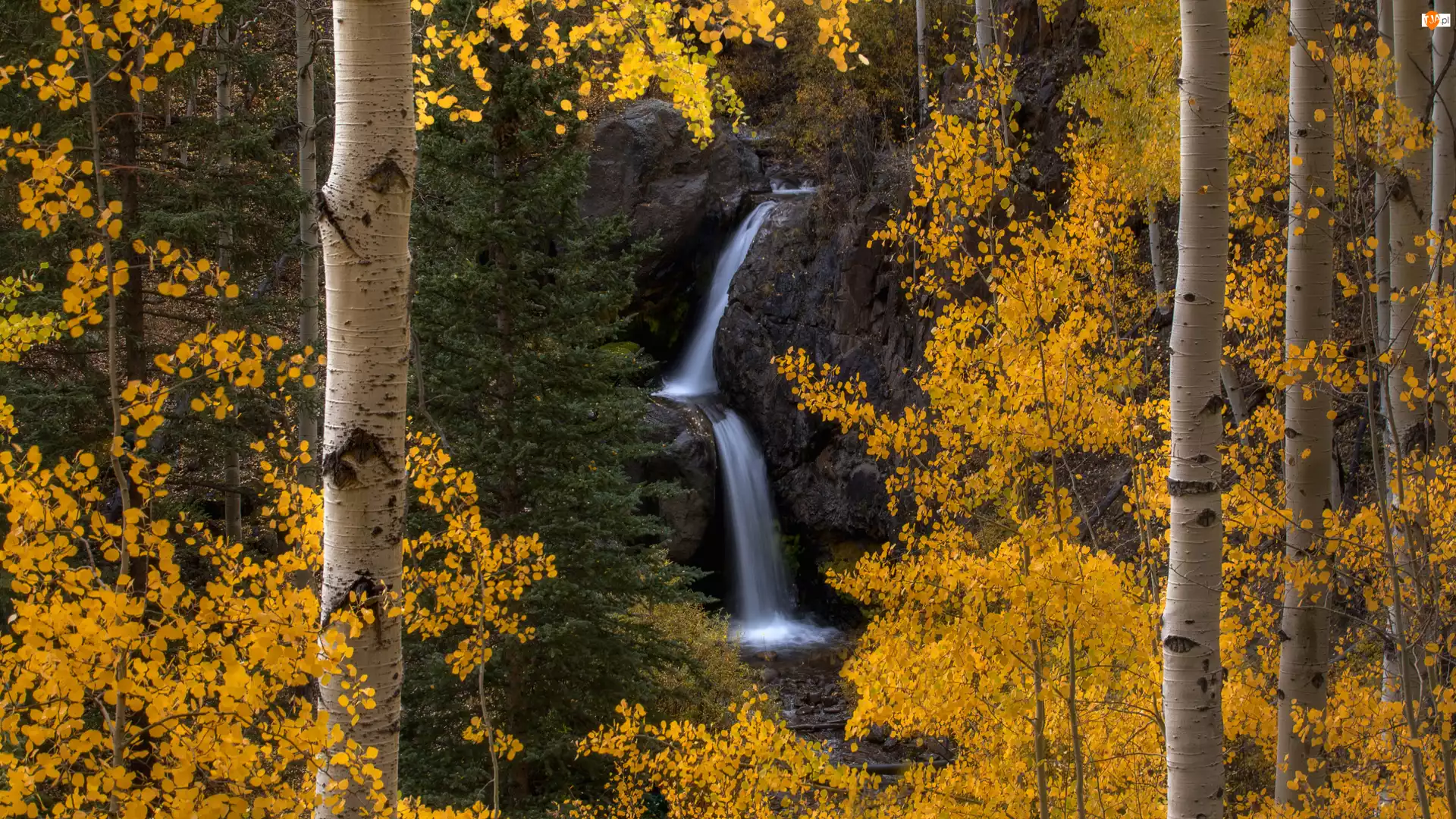 Nellie Creek Falls, Jesień, Brzozy, Kolorado, Las, Wodospad, Stany Zjednoczone, Drzewa
