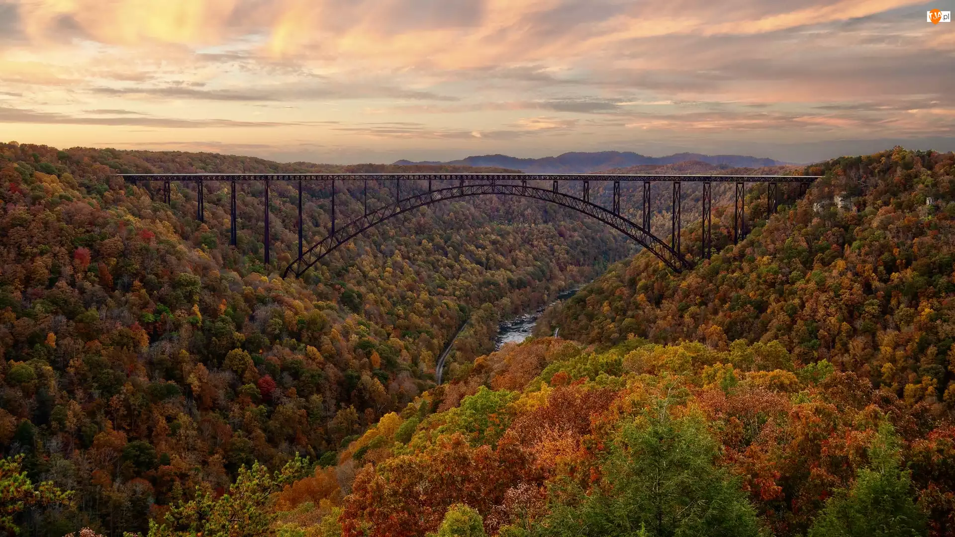 New River Gorge Bridge, Stany Zjednoczone, Rzeka, Jesień, Wirginia Zachodnia, Most, Lasy, Wąwóz