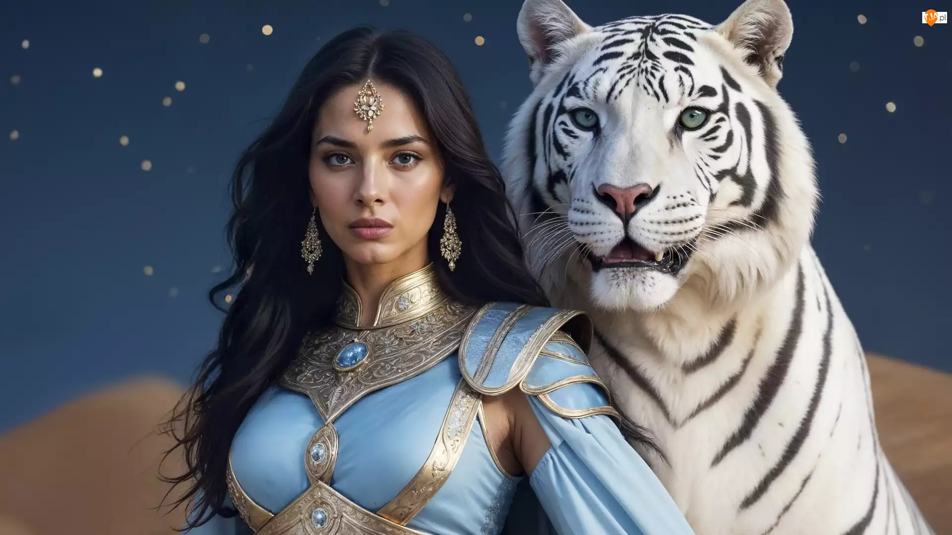 Niebieska, Dziewczyna, Biżuteria, Tygrys, Sukienka, Biały