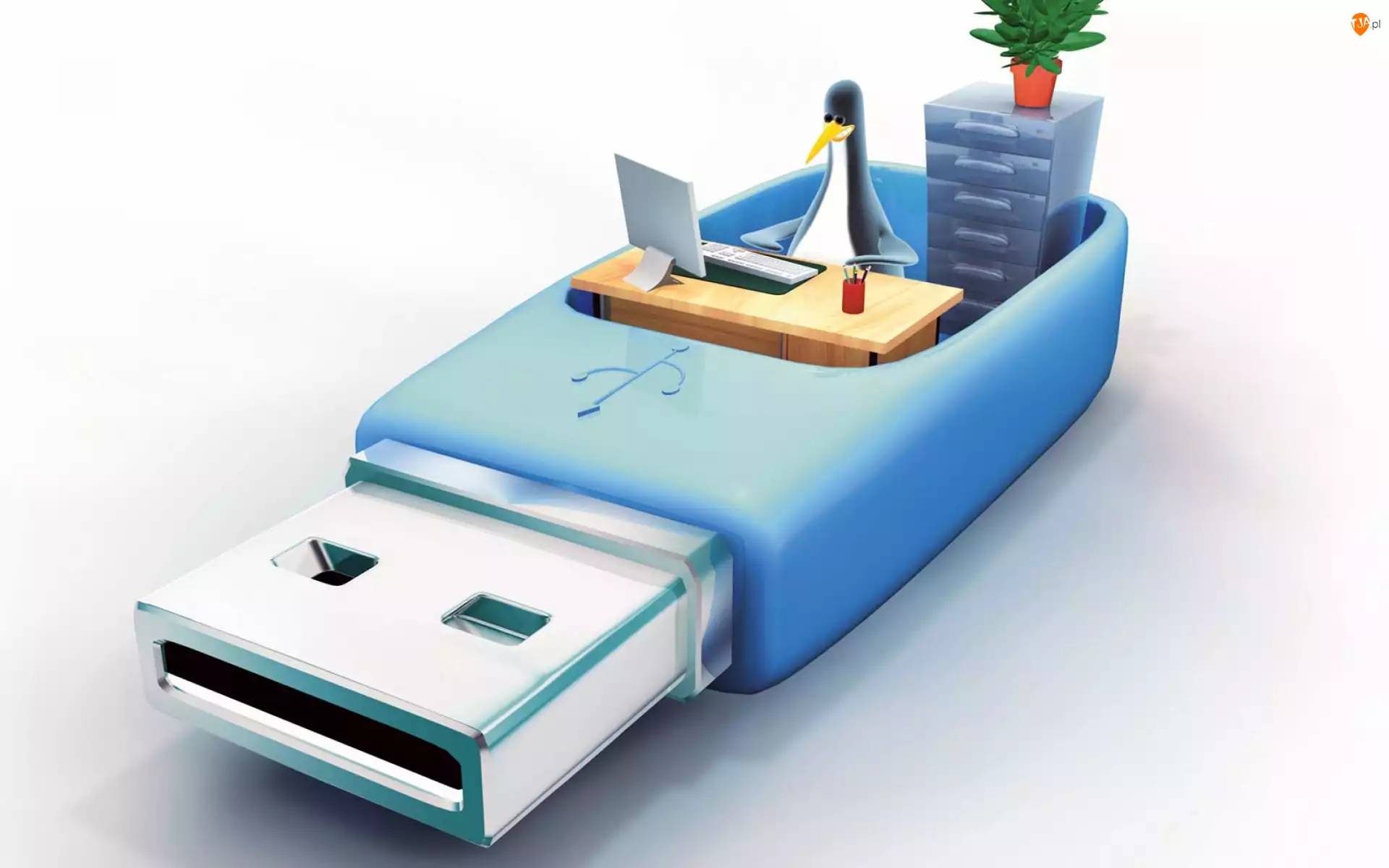 Niebieski, Biuro, Pendrive, Pingwin