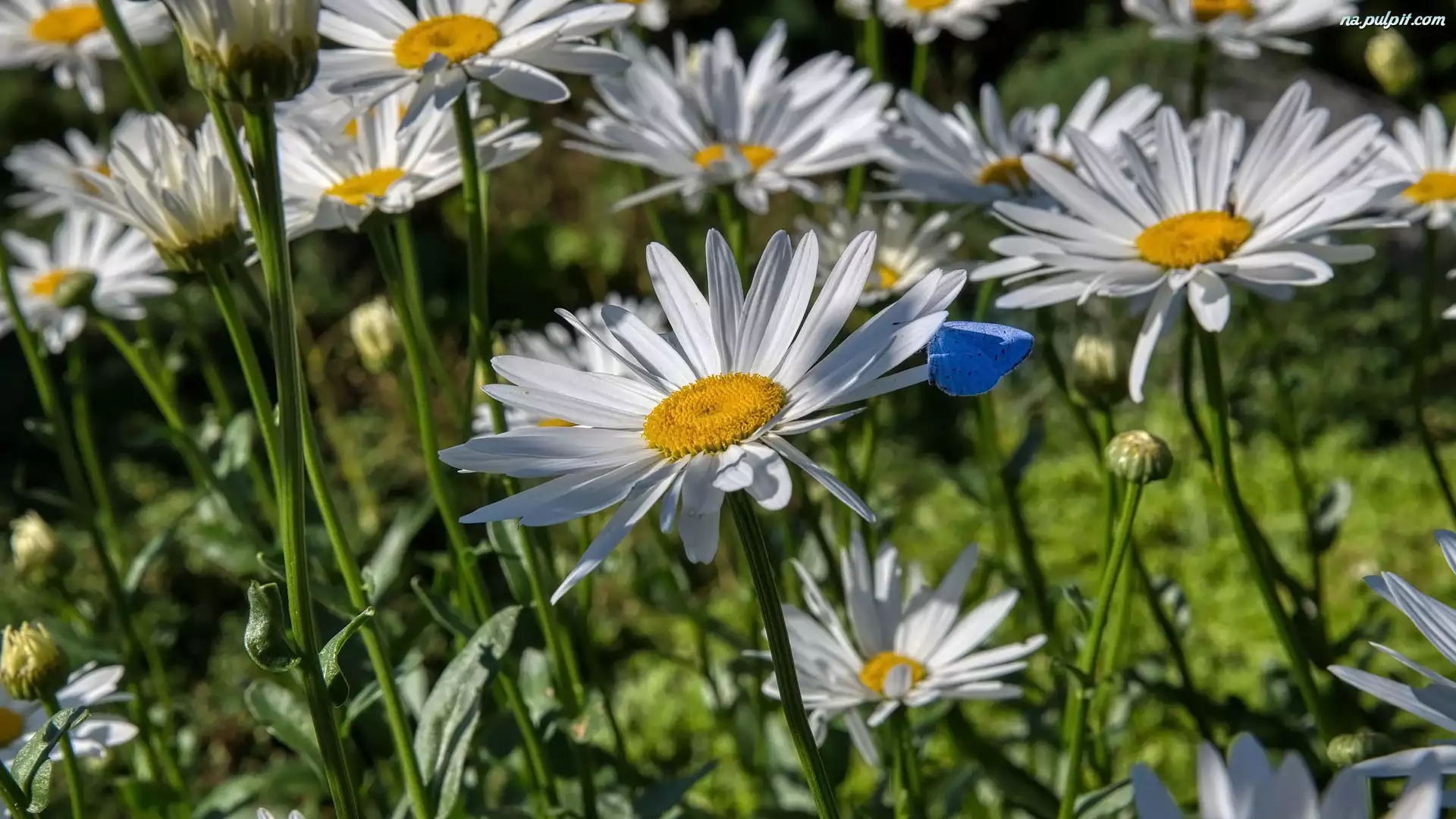 Motyl, Kwiaty, Margerytki, Niebieski