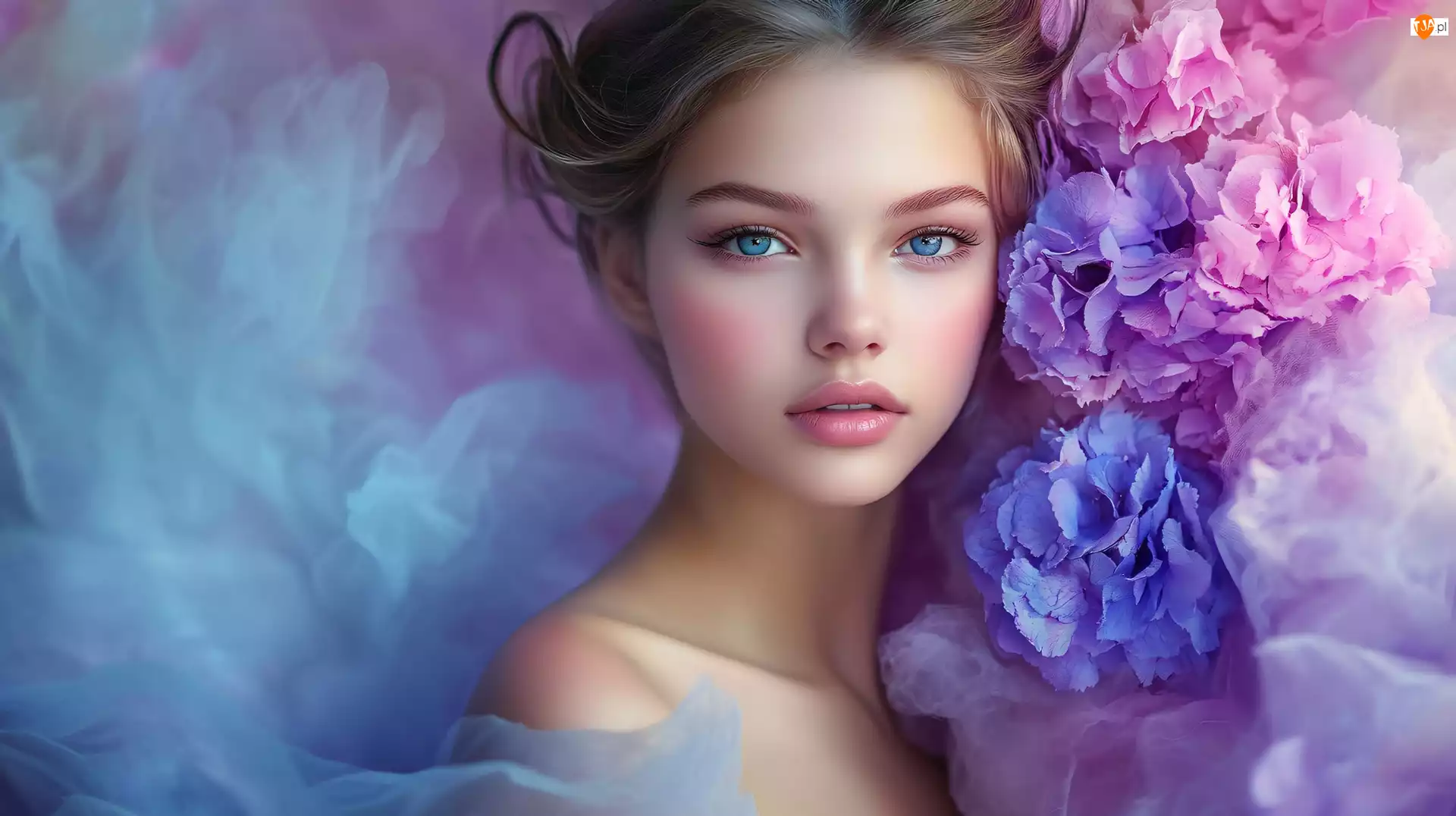 Niebieskie, Dziewczyna, Kwiaty, Grafika, Oczy, Hortensje