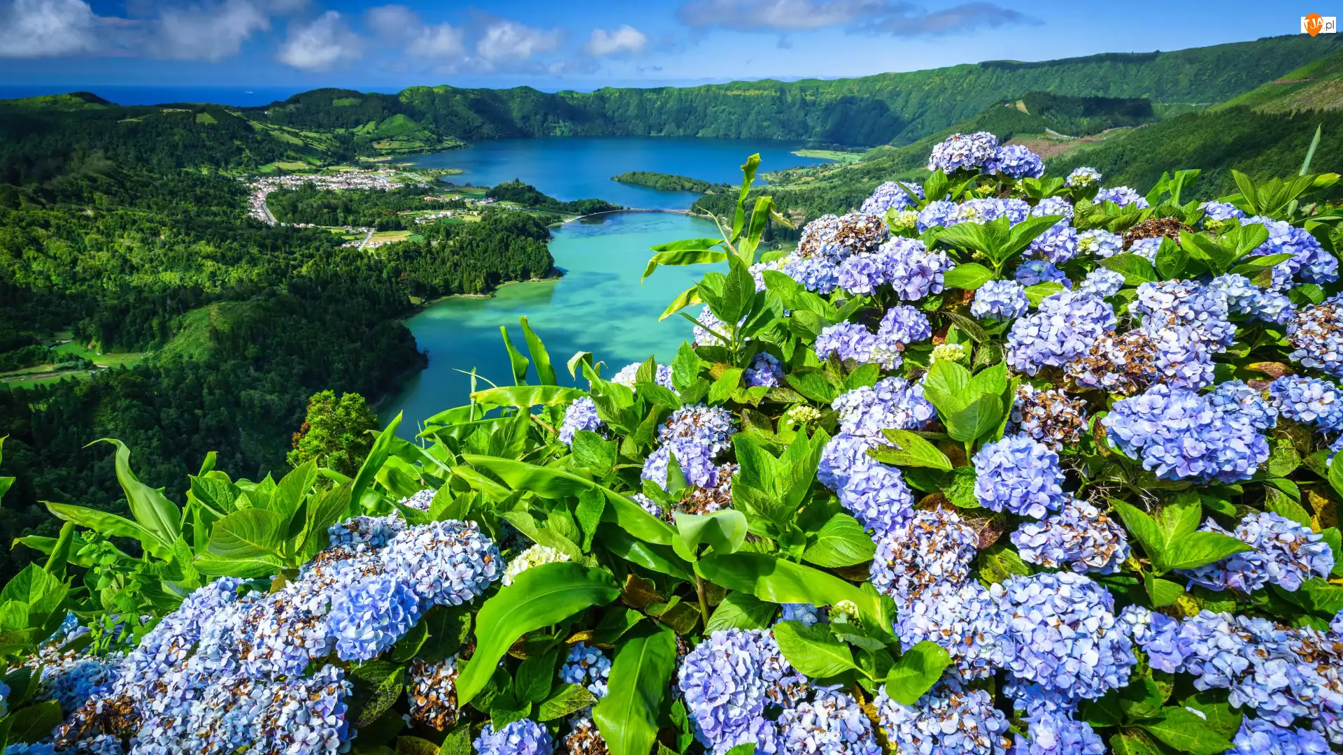 Hortensje, Jeziora, Portugalia, Kwiaty, Azory, Jezioro Verde, Jezioro Azul