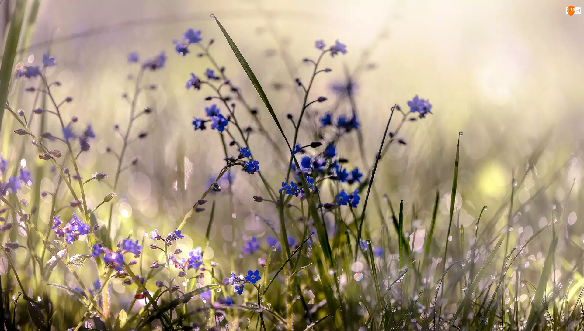 Niebieskie, Kwiaty, Trawa, Rosa, Niezapominajki, Rozmycie