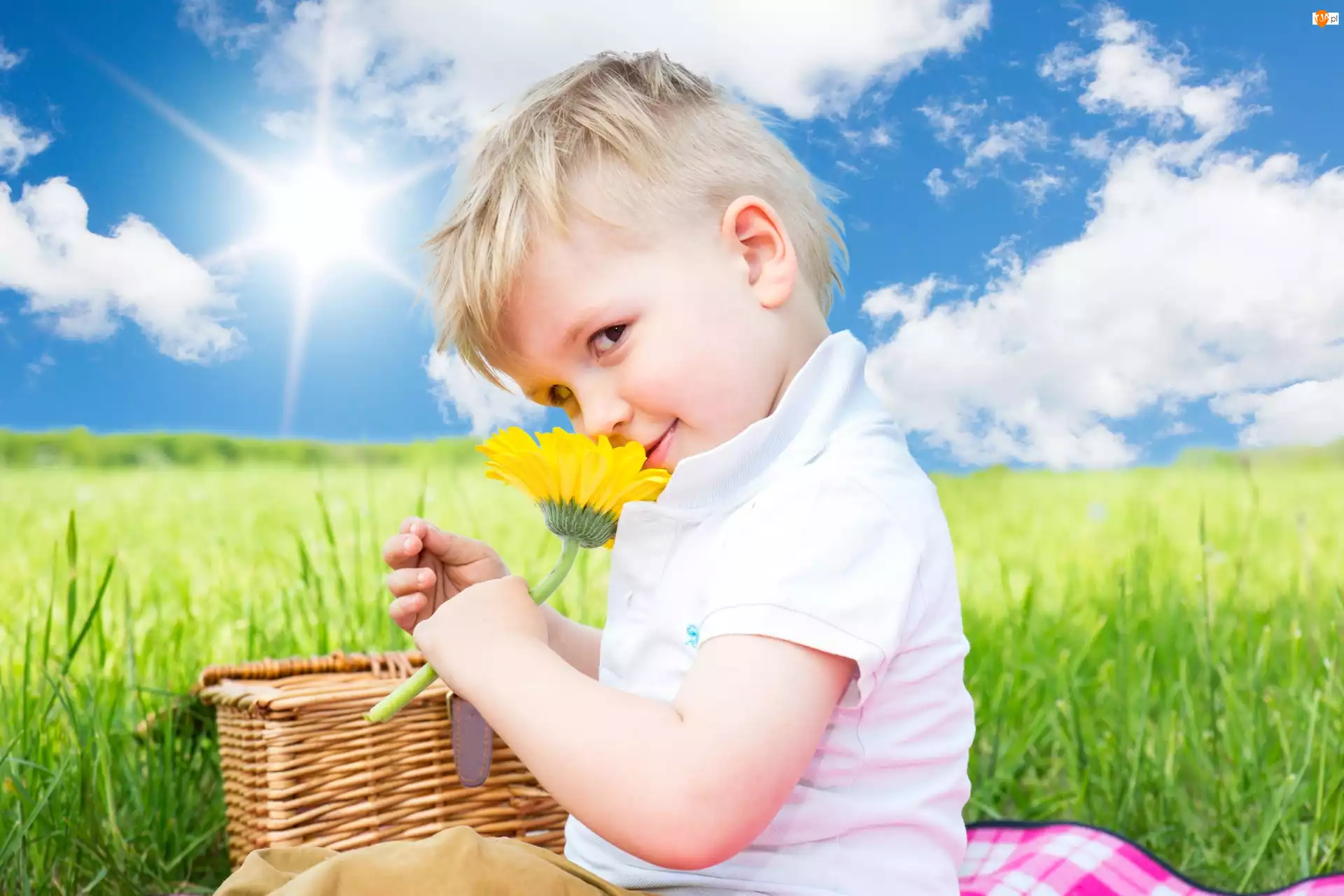 Niebo, Dziecko, Koszyk, Kwiat, Trawa