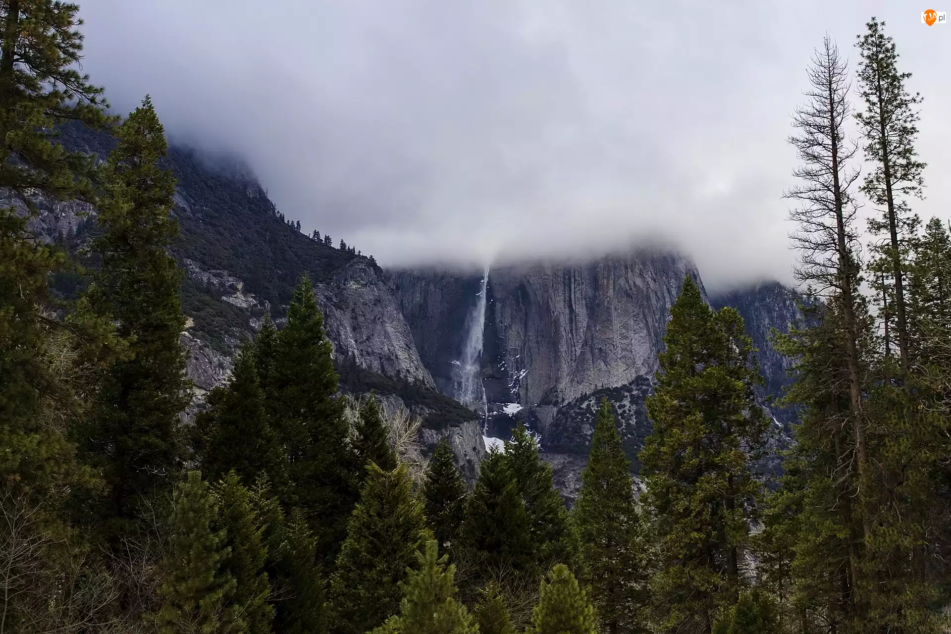 Niebo, Góry, Las, Wodospad, Zachmurzone