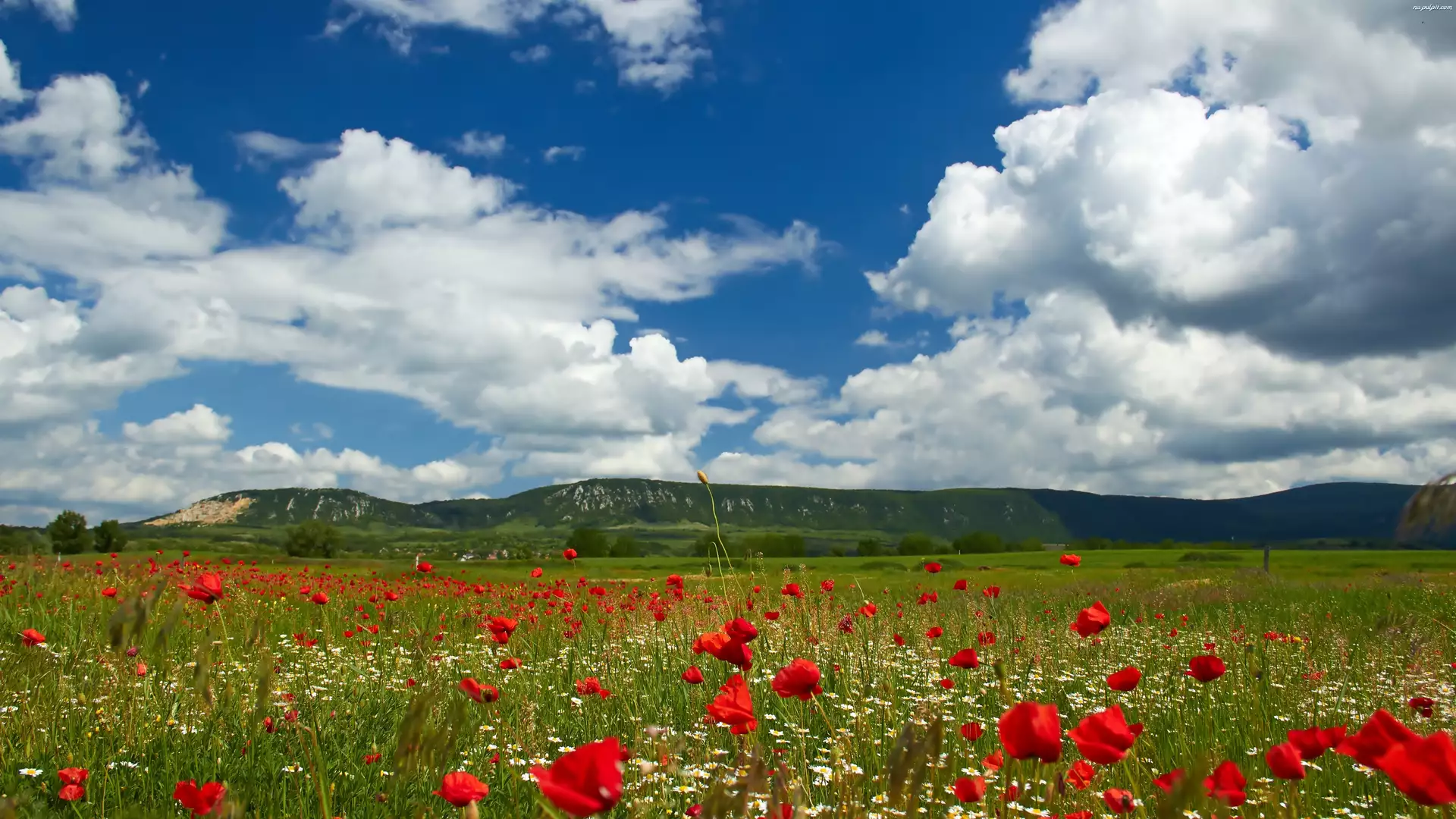 Niebo, Rumianki, Trawa, Łąka, Chmury, Maki, Gór