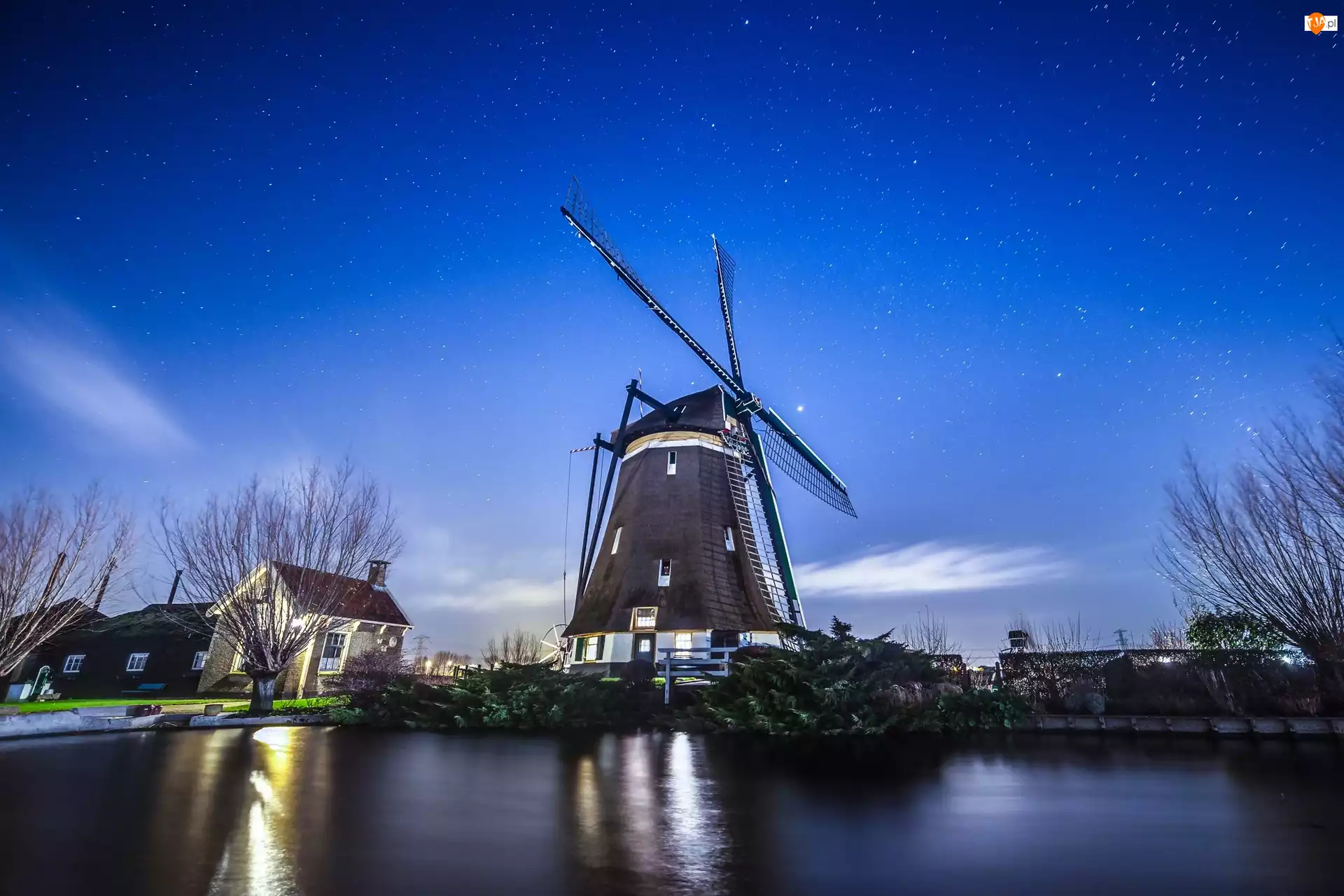 Wiatrak, Niebo, Gwiazdy, Woda